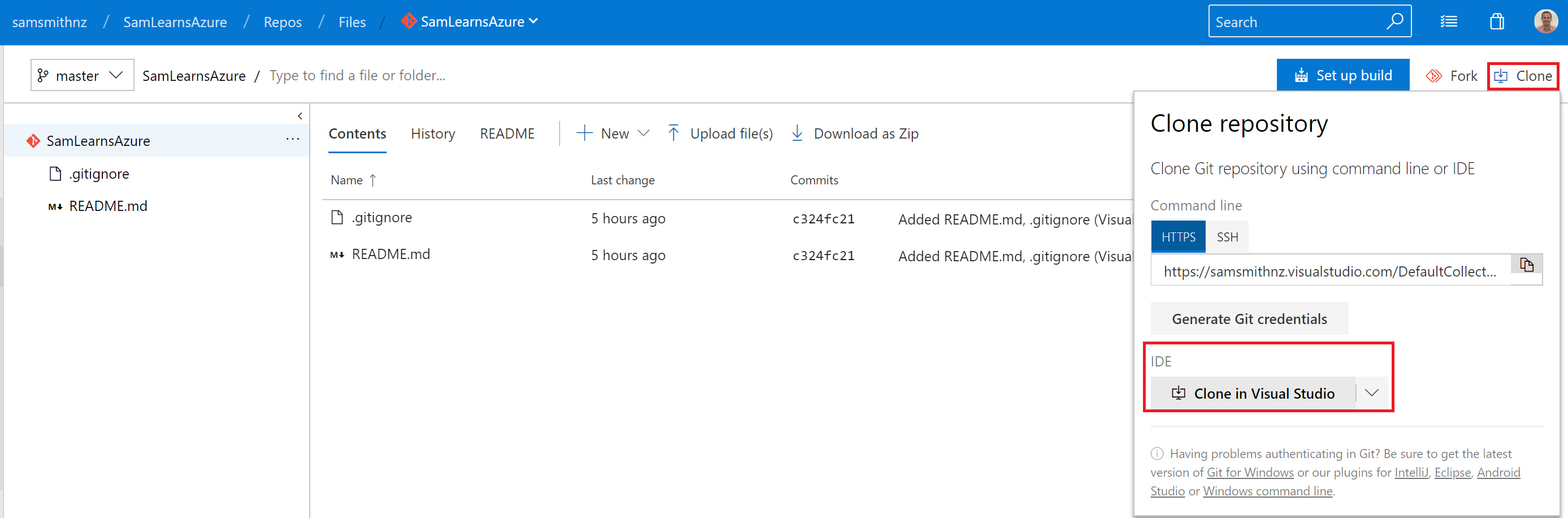 As we haven’t developed in this project yet, the first step is to browse to the repo and clone it, we are going to use the Visual Studio option.