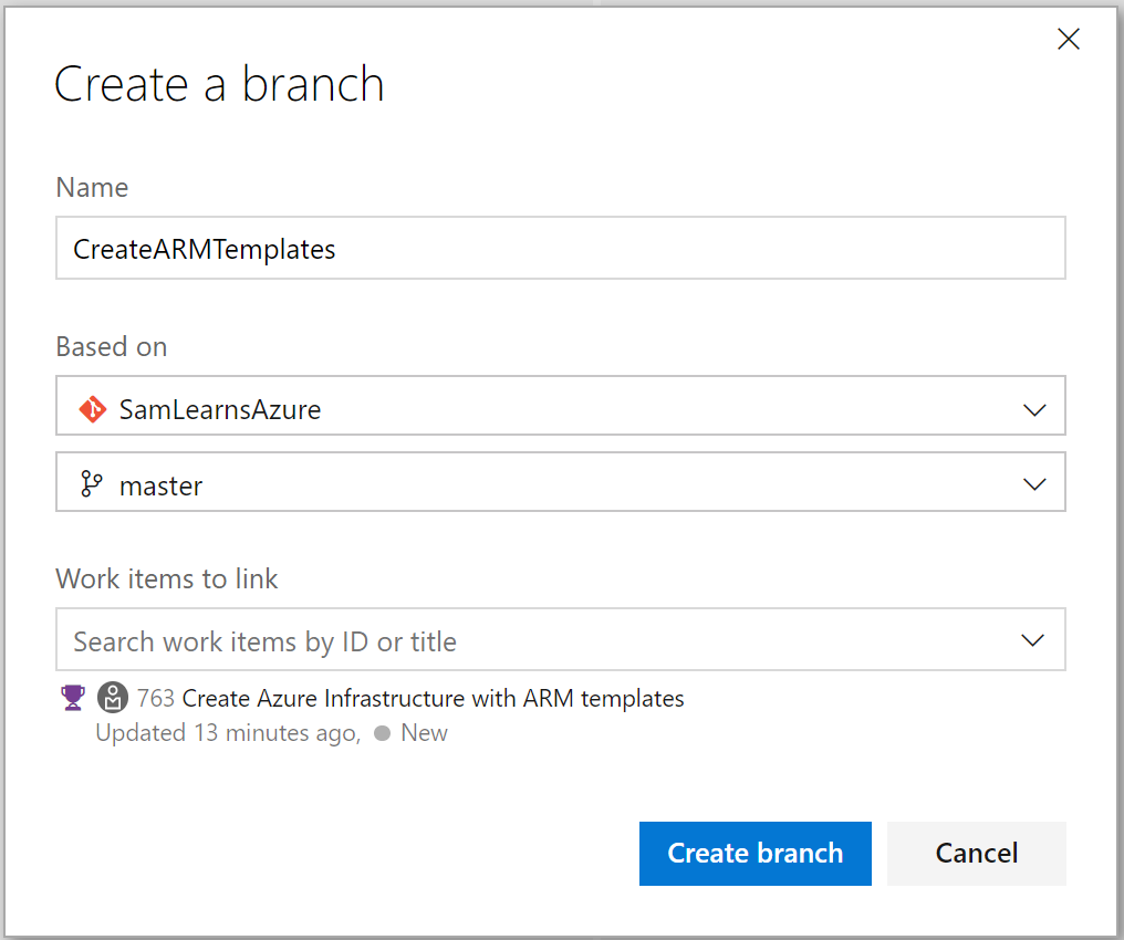 This will show the “Create a branch” popup, where we can enter in a name for our new branch, taking a branch from our master branch. Attached to this work you’ll notice it’s already linked our “#763, Create Azure Infrastructure with ARM templates” work item. This is important later, as we merge back to the master branch, where it will show the complete work flow – we will get back to this again later.