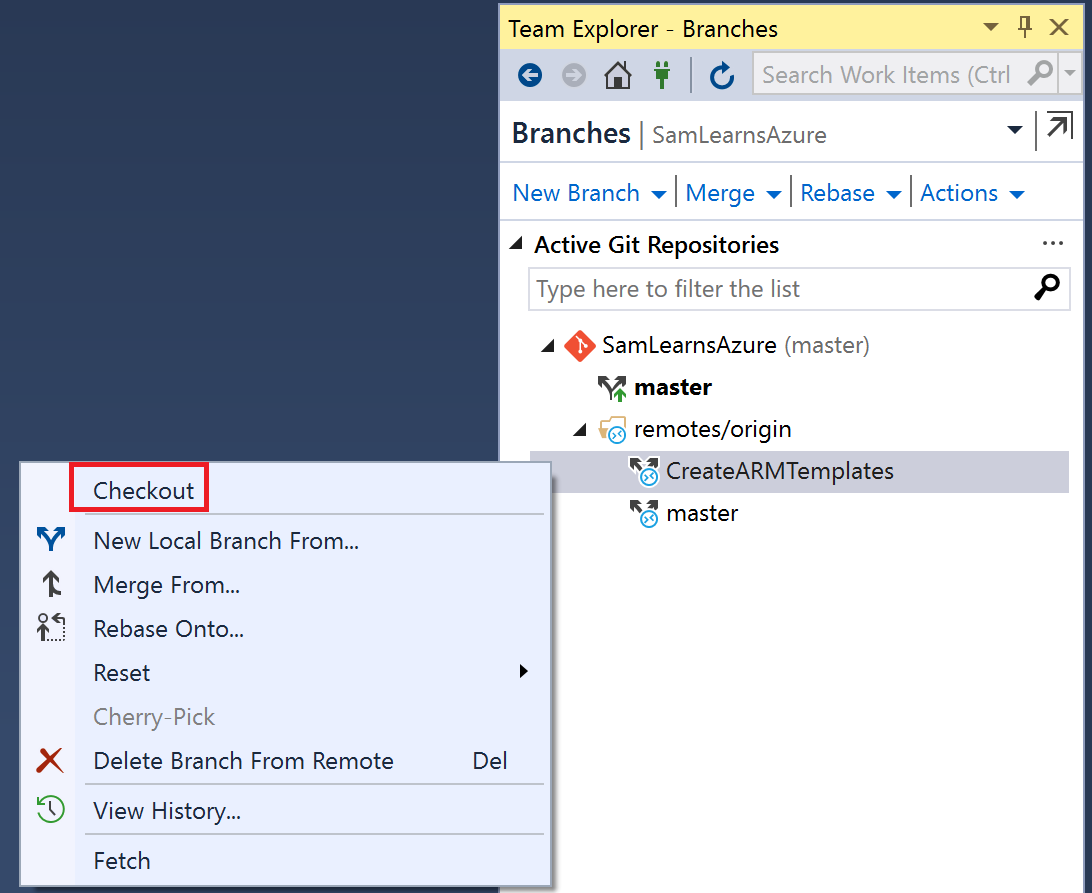 Moving back to Visual Studio, we open the “branches” tab in the “Team Explorer” panel and right click on the remotes/origin > CreateARMTemplates branch, and then select “Checkout”, to download the branch locally, switch to the branch and open it in Visual Studio.