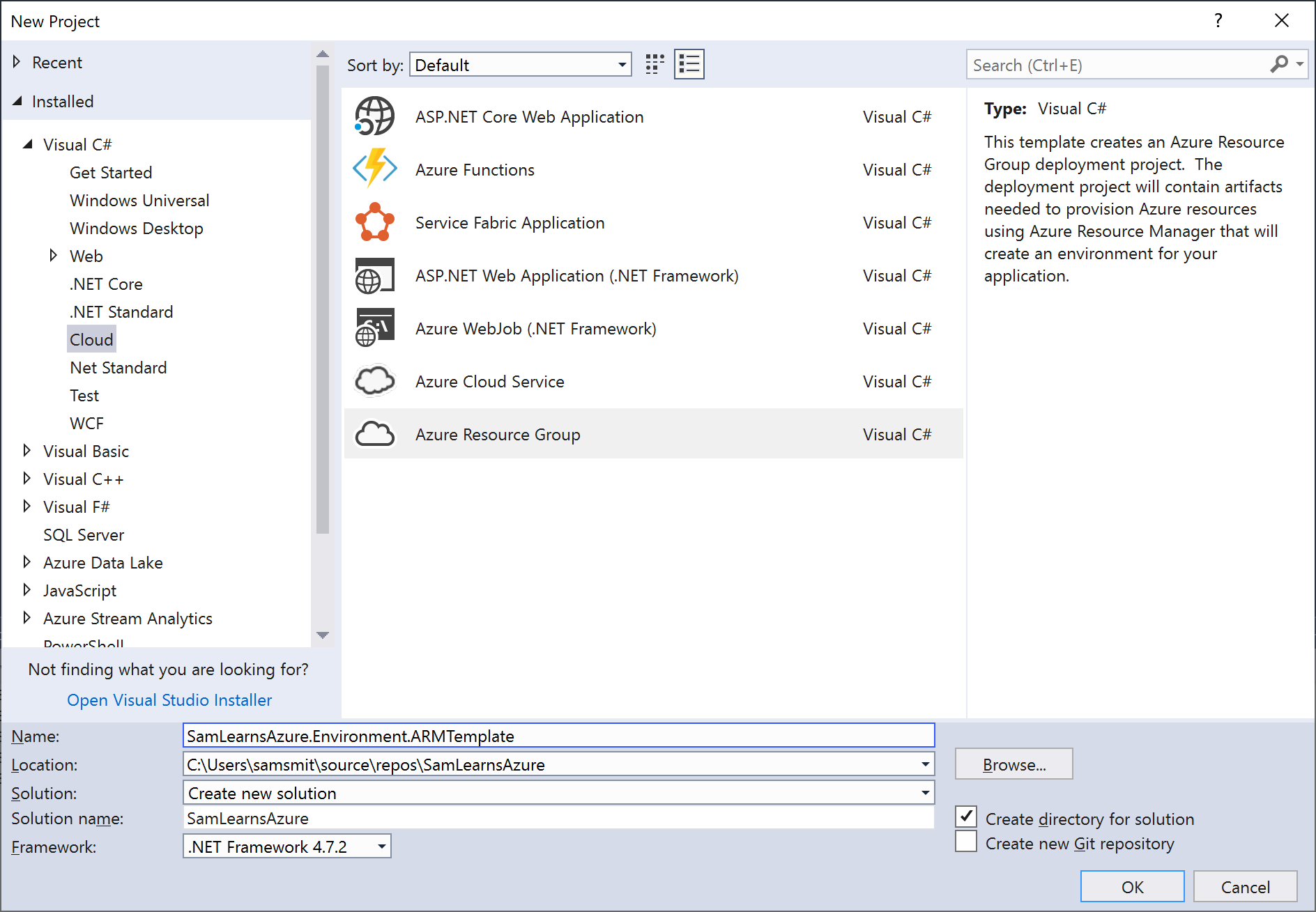 In Visual Studio, we create a new solution, “SamLearnsAzure”, and add a “Azure Resource Group” project for the ARM template’s, named “SamLearnsAzure.Environment.ArmTemplate”.