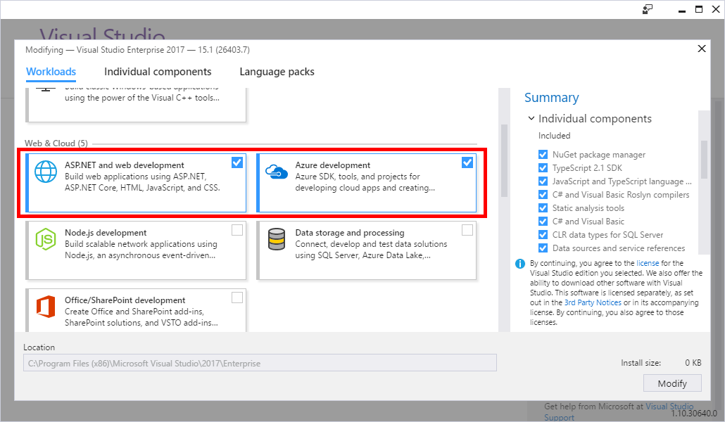Note that if you don’t see the “Azure Resource Group” project template, ensure that you have installed the following workloads in “Visual Studio Installer” first: