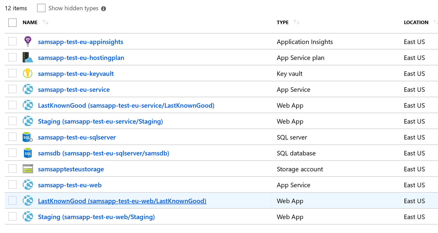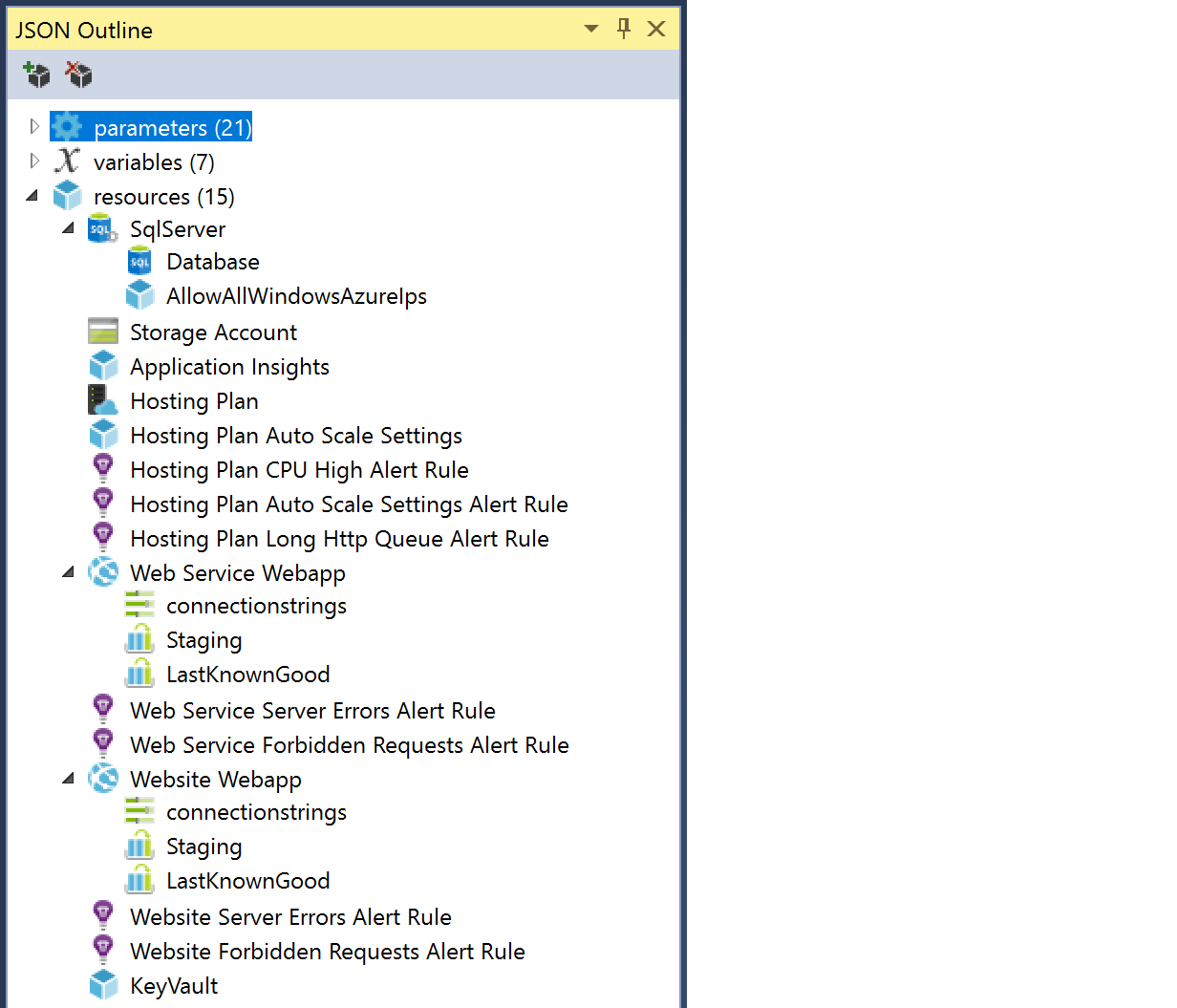 - The Web Service WebApp, with connection strings and two slots, Staging and LastKnownGood. We also have two alerts for Server Errors and Forbidden requests.