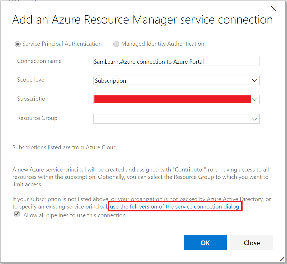 We can use the Get-AzureRMADServicePrincipal command to get the Azure DevOps service principal, but first we need to find the object id. If we open Azure DevOps, and browse to the Service Connection we created in the seperate blog post, there is an “use full version of the service connection dialog” link we will open. This full version dialog has useful information we don’t normally need – in fact we only need this once – today.