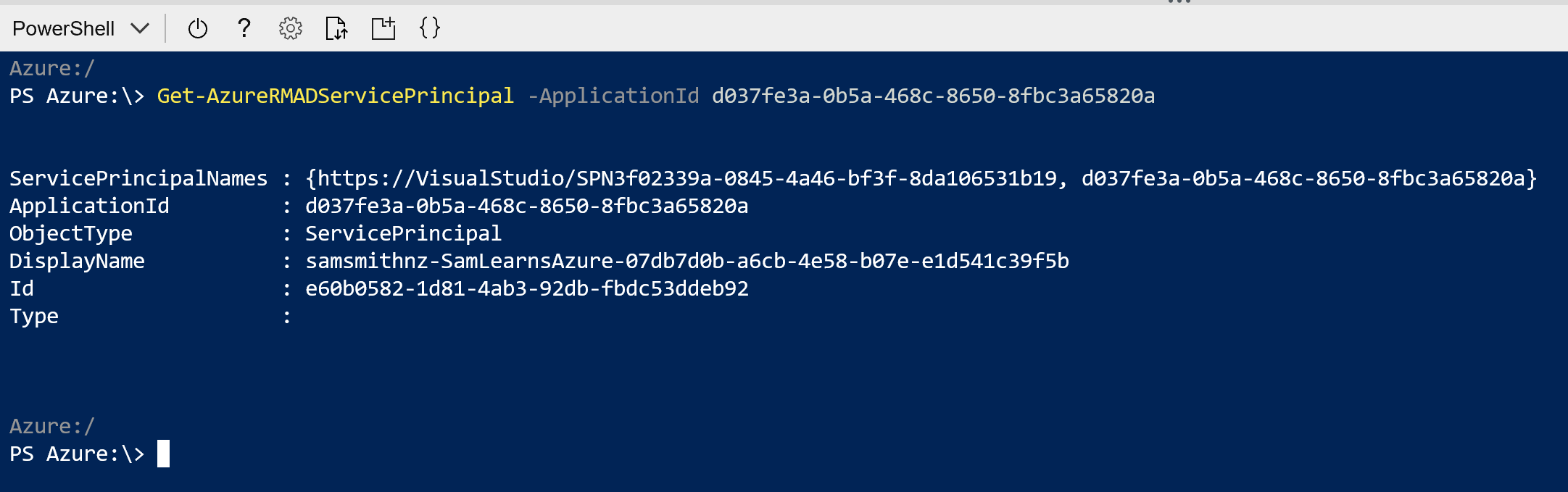 Back in our Azure CLI window, we run the command Get-AzureRMADServicePrincipal -ApplicationId d037fe3a-0b5a-468c-8650-8fbc3a65820a, to get an Id, which we make note of for a little later.