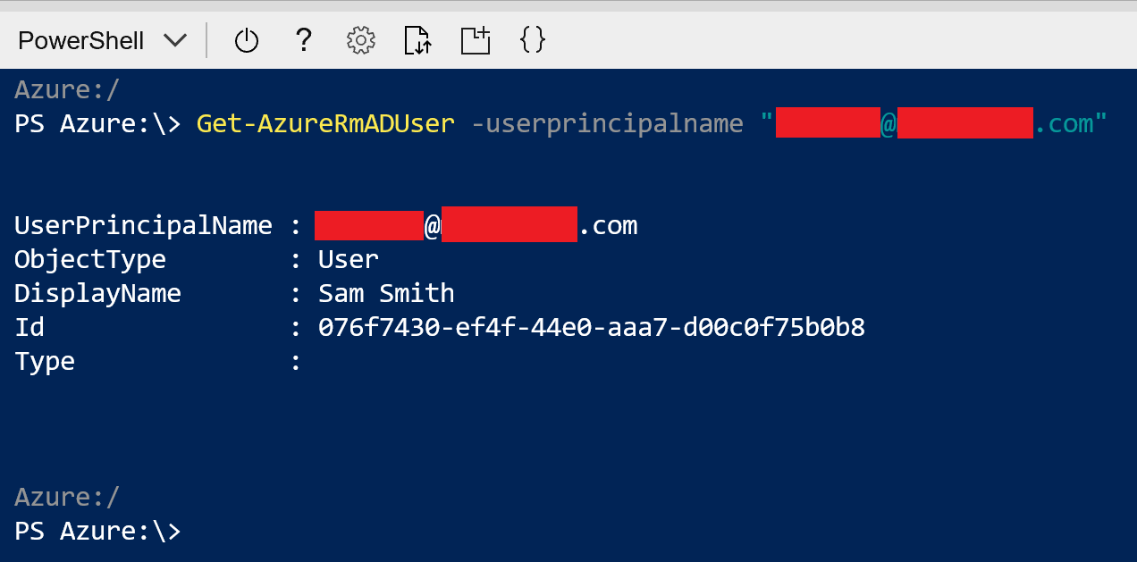 We also run a similar command, Get-AzureRmADUser -userprincipalname “my@emailaddress.com”, to get the administrator Id.