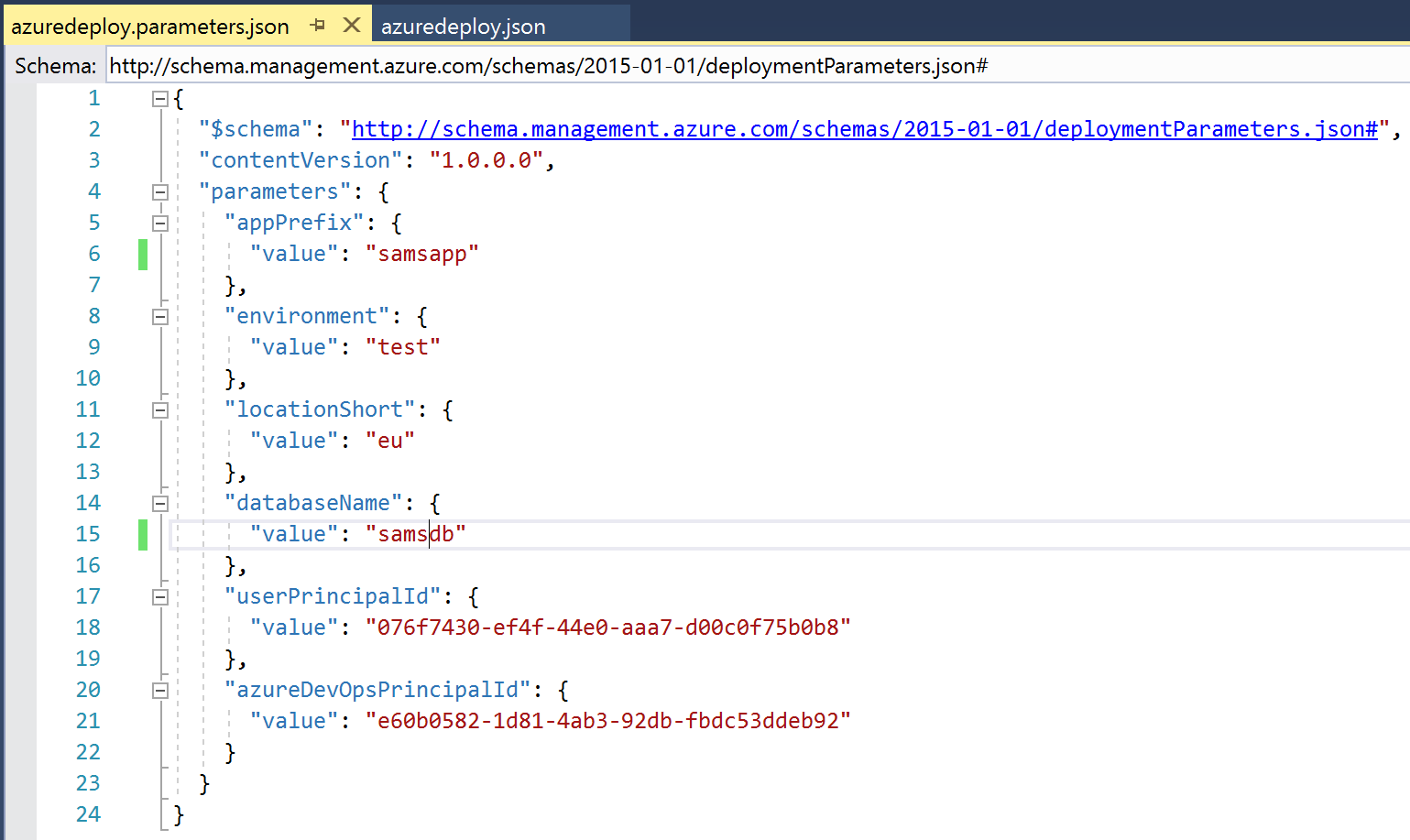 Using this Id information we can add some parameter defaults to our ARM Template parameters file, including the application prefix “SamsApp”, the environment “test”, the location “eu” (short for the Azure East US region), the database name “SamsDB”, and the user and Azure DevOps prefixes. All of our other properties will be set dynamically depending on the context. You can see more details of this in the code, which as we mentioned earlier, is in a public Azure DevOps project.