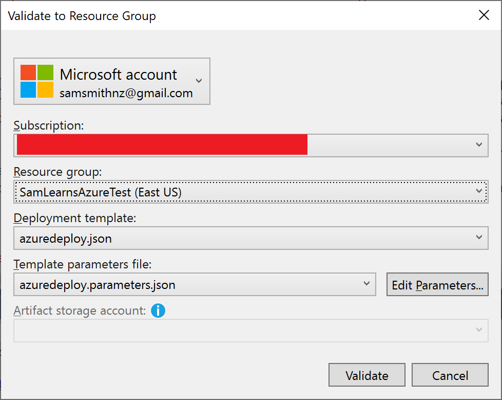 With the ARM Template built, it’s time to validate and test a deployment. To validate the template, we right click on the project and select “Validate”. Validating allows us to mock a deployment to Azure, which confirms that all of the syntax of our ARM Template is correct. There is a little bug here – sometimes the Validate menu item doesn’t appear and you need to close Visual Studio and reopen it.