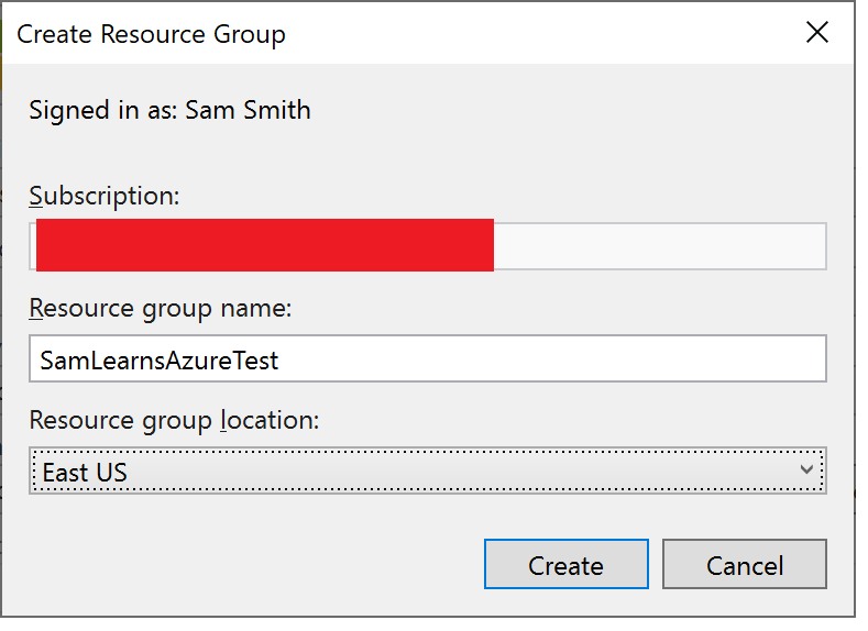 Once added to the release environment, we edit the Azure details, setting the subscription, (this drop down asked us to authenticate before continuing). We can then update Resource Group, setting it to “SamLearnsAzureDev”, and confirming the location as “East US”.