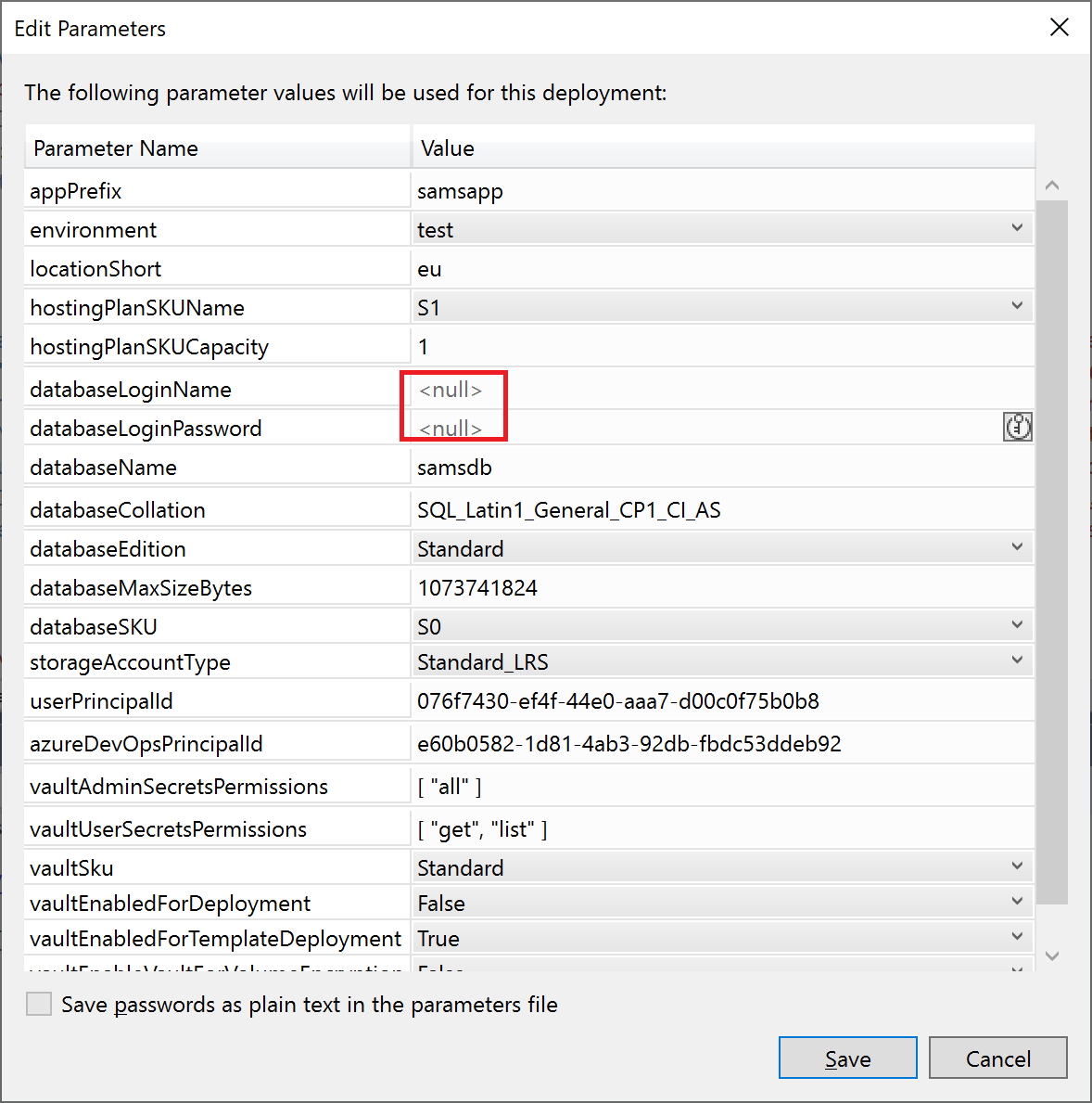 With the resource group selected, we can click on the “Edit parameters” button and see all of our parameters. This is where we can see how all of our default parameters are pre-populated – everything except for two, the database login and password. We don’t want these secrets stored in our code, that isn’t secure, so we are going to leave them blank and fill them out as we deploy, as we will see shortly. Note that if you do fill them out here, they will be saved into the parameters file – e.g. in code, and then will be visible in your source control – this is not good!