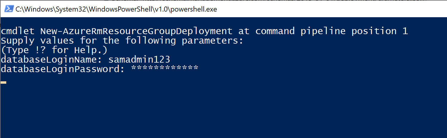 Starting the validation, a PowerShell window opens and prompts us for any missing parameters – in this case the database login and password. Since we aren’t actually deploying resources, we can type whatever we like here. Note that sometimes this PowerShell window minimizes, and you need to reactivate it – otherwise it appears as though the deployment has frozen.