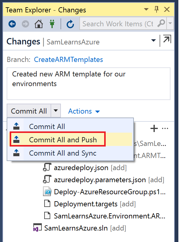 With our development and testing complete, we are ready to push our changes to Azure DevOps. In the Team Explorer, we write a comment, “commit all and push” our changes to the server.