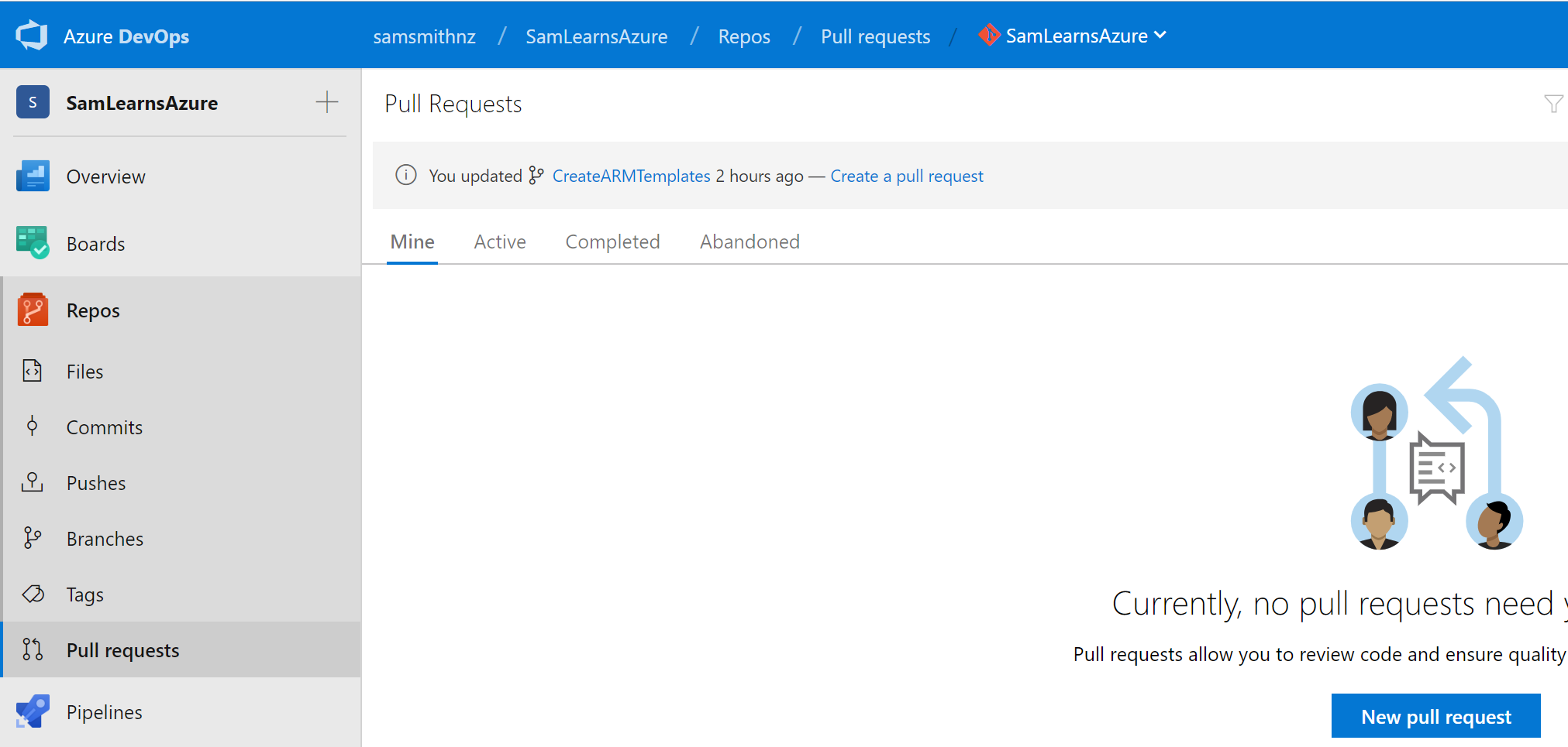 To create a Pull Request, we browse to “Azure Repos” and select the “Pull requests” menu item. We can click the “New pull request” button, or click the helpful link that detects a recent code push – we are clicking on this link!