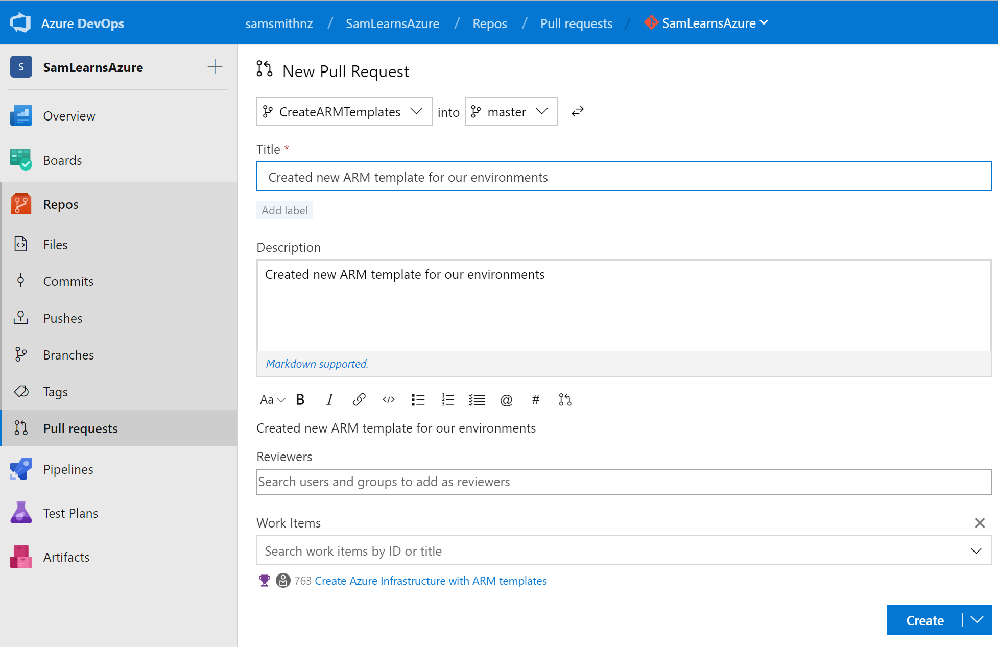 In the “New Pull Request” page, we can see our commit comment is automatically populated as the title and description, and the work item we branched from is also linked. We click the “Create” button.