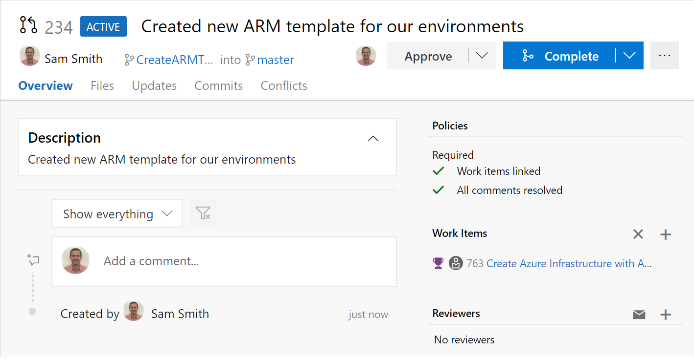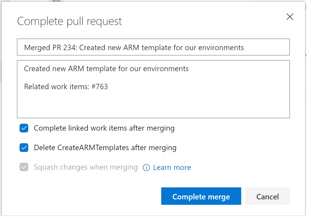 This shows the “Complete pull request” popup dialog. to move to the next stage and merge the CreateArmTemplate branch into the Master branch. Note the “Complete linked work items after merging” checkbox that automatically completes work items. This is a huge feature, especially for team members who have to chase developers for work item status.