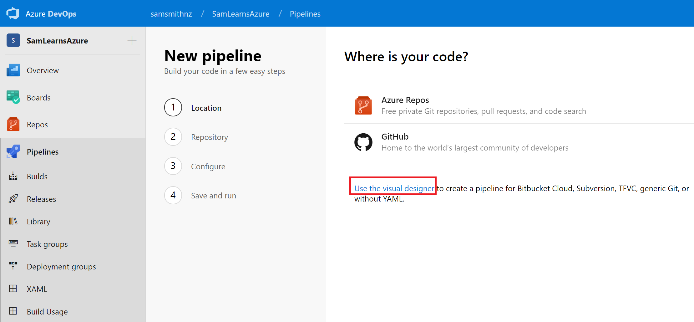 It’s time to create the build. As we aren’t actually building any code, this will be straight forward. First, we click new pipeline. We aren’t going to use YAML yet, so we will click the “Use the visual designer” link.