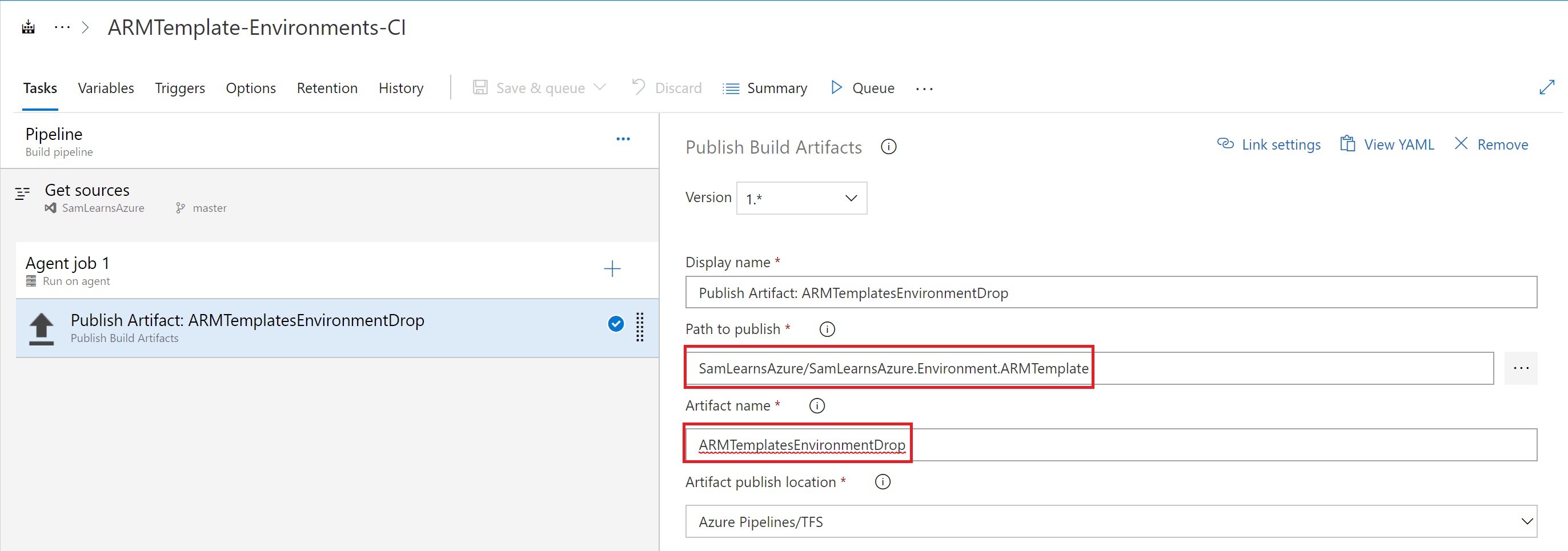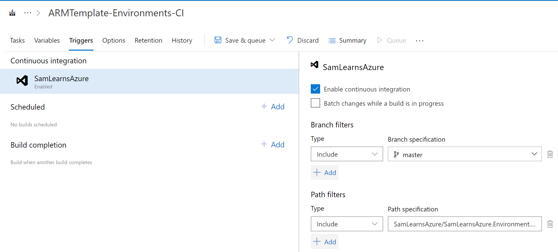 Finally, we update the triggers, so that whenever the ARM template code changes, we trigger a new build. We use the path filters – specifying the location of the ARM template files, to ensure that this build will only trigger if a change to the ARM template project is made.