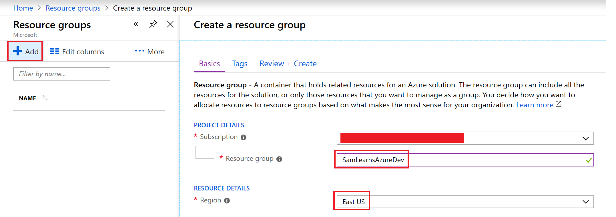 Validating requires an existing resource group, which we can create by clicking on the resource group drop down and selecting “Create New”. In this screenshot I’ve created the resource group already.