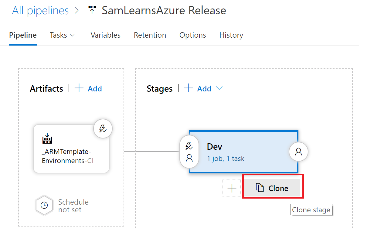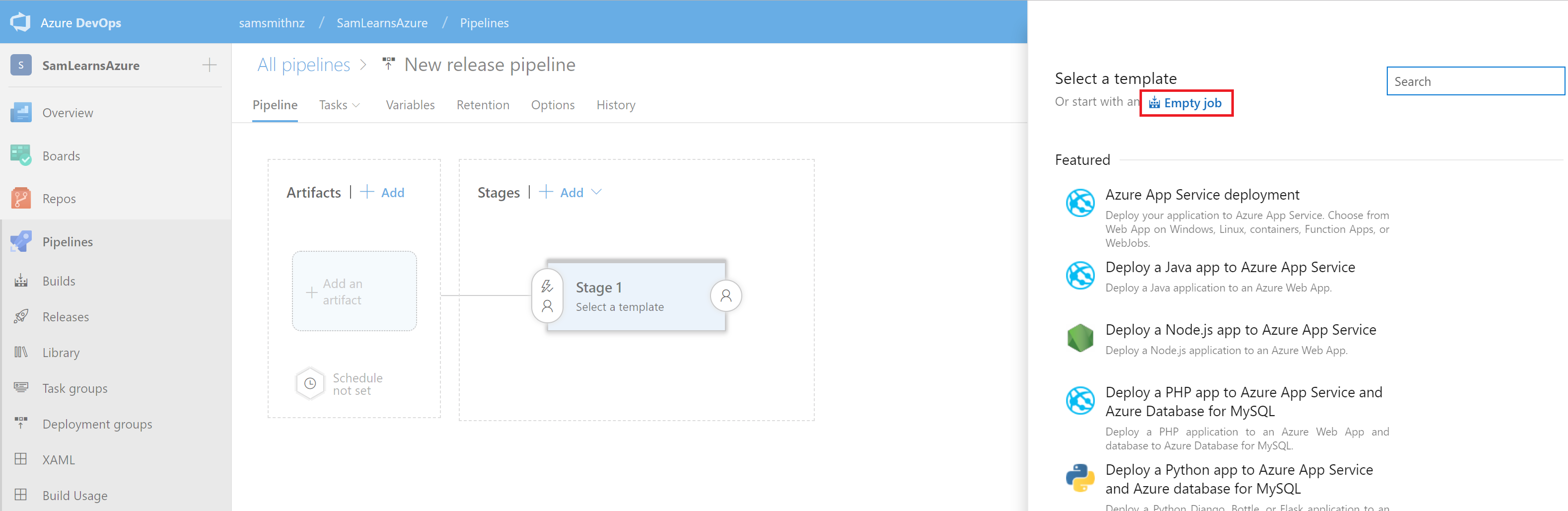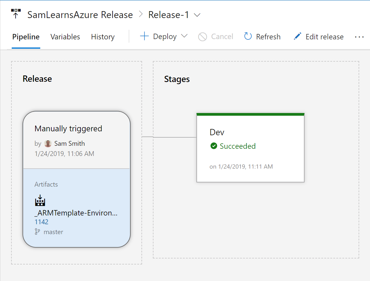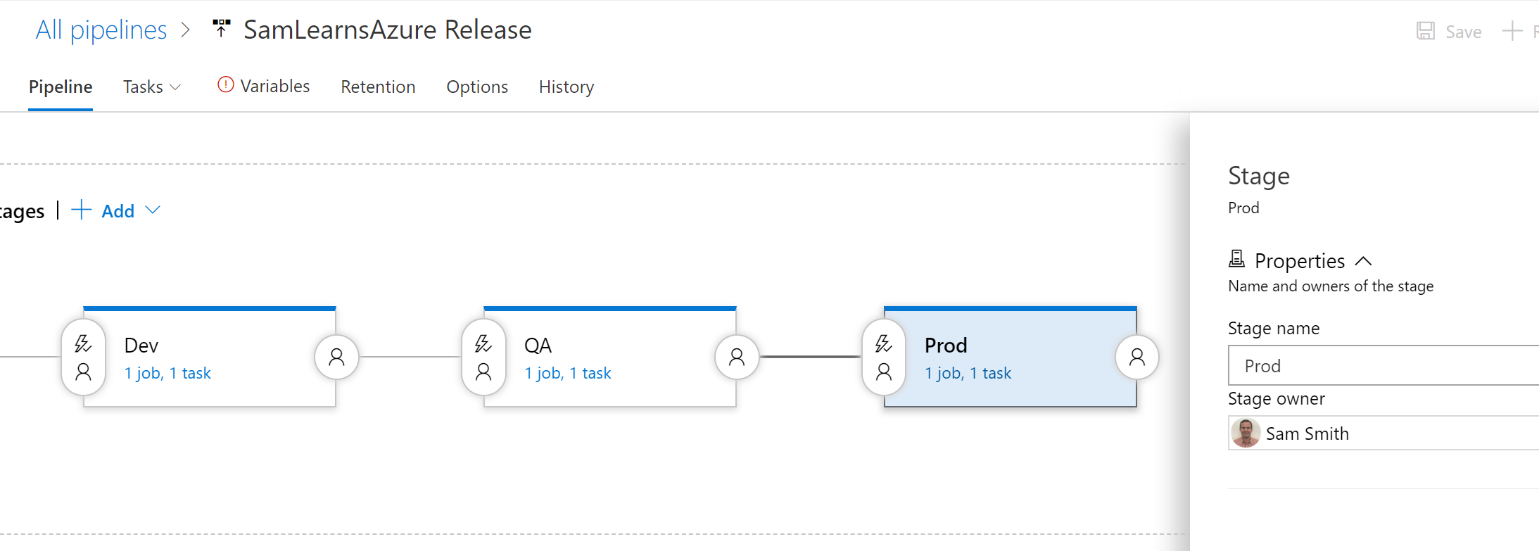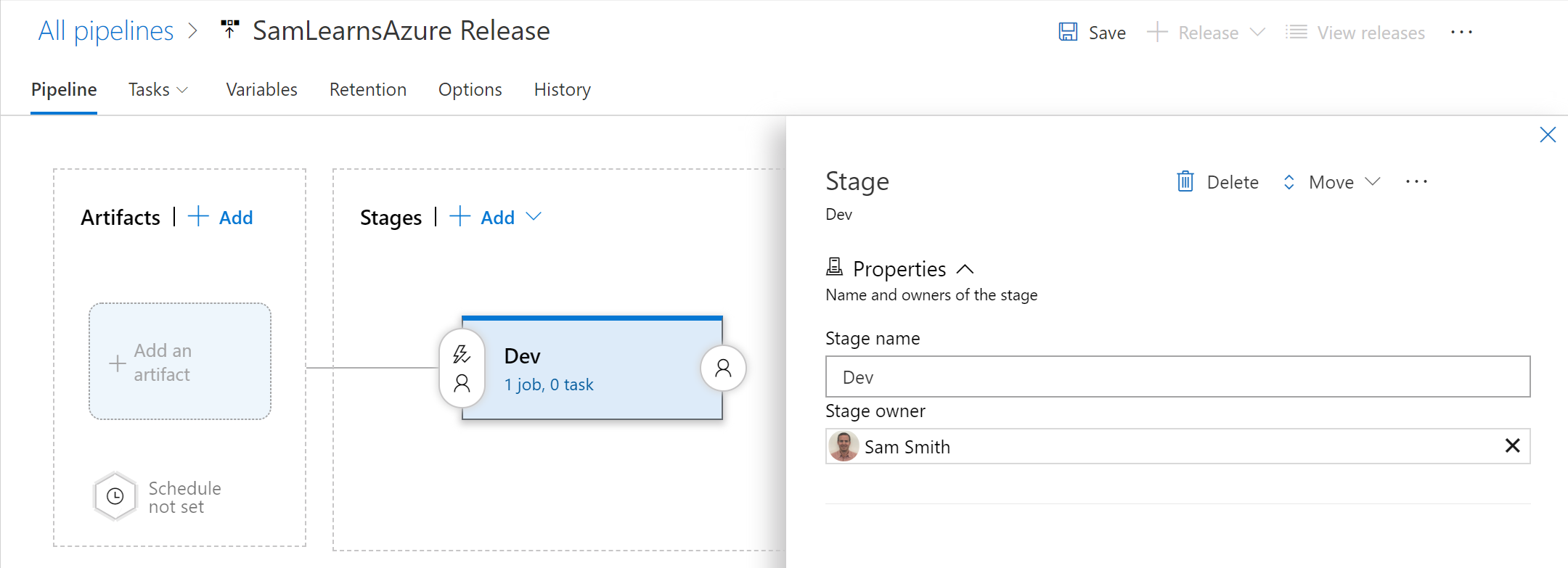 Next we are going to update the release and stage properties. First we will rename the release to “SamLearnsAzure Release”, and the stage to “Dev”