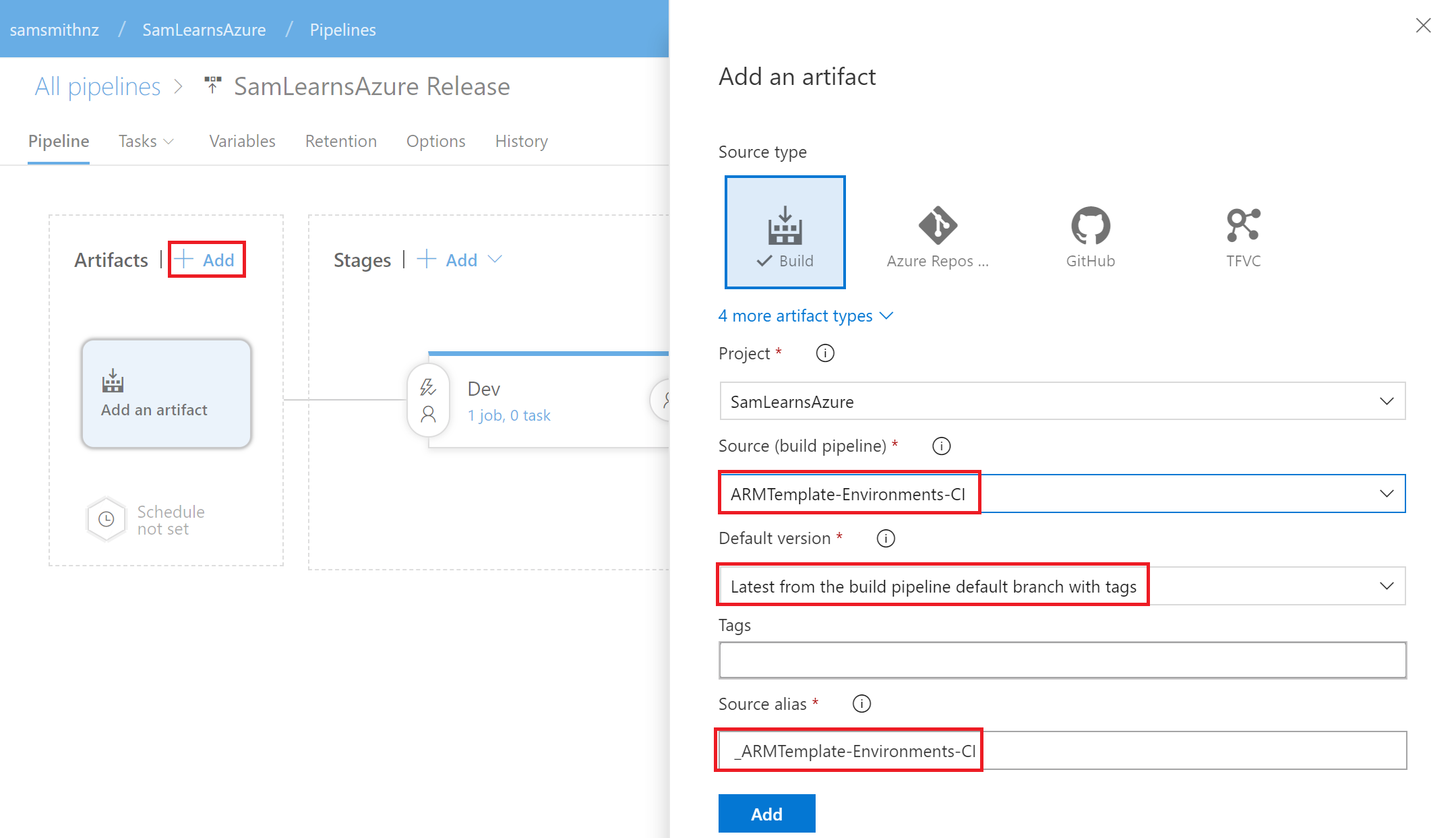 Next we are adding the build artifacts. By clicking the highlighted “+Add” button, we can add the “ArmTemplate-Environments-CI” build, specifying the default version (latest from the default/master branch). We don’t need to specify tags, and use the default source alias.