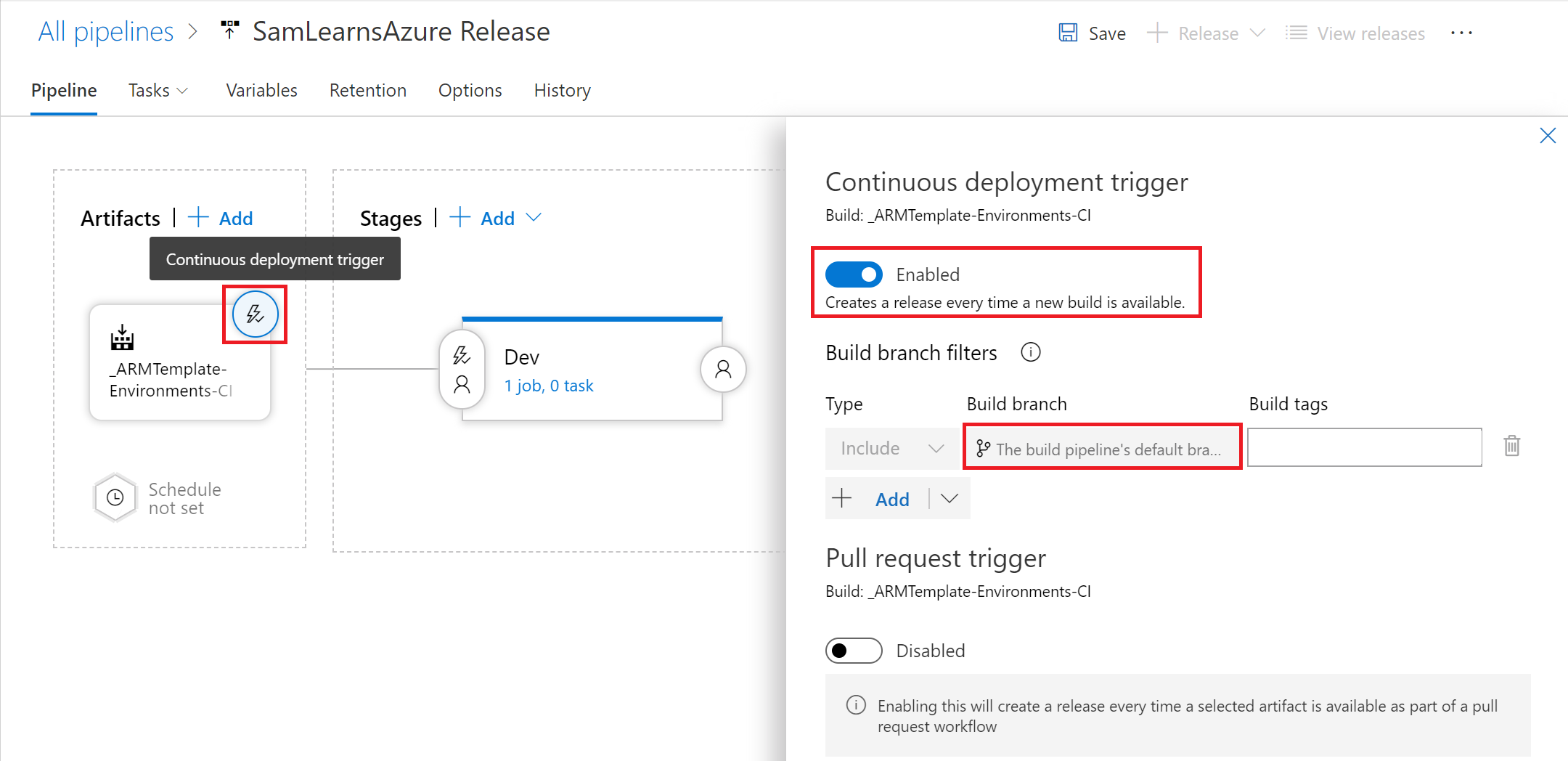 Next we are going to setup the continuous deployment trigger, by clicking the lightning bolt icon in the top right of the artifact. We checked the “Enabled” radio button, and set the “build branch” to be the default/master branch. This is important, so that a Pull Request build won’t trigger a release.