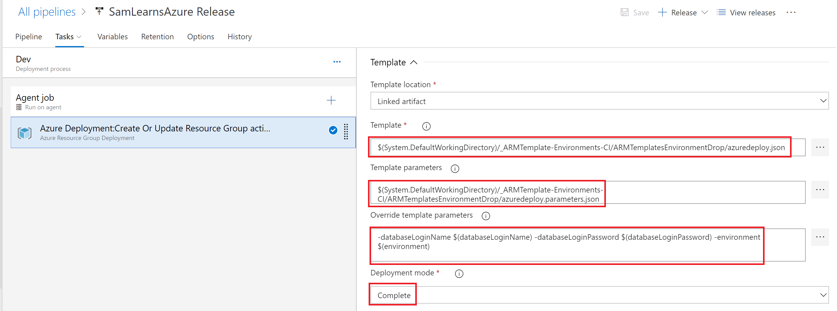 Next, scrolling down on the task, we can set the Template details. Here we browse the build artifact to select the template and template parameters files. Then we can set any overrides – where we specify the database login name, database login password, and the environment, all using variables (accessed with the syntax “$(variablename)”. Finally we change the deployment mode to “Complete” – this updates the resource group to match the ARM template, fixing an important issue with infrastructure – “configuration drift”, and helps to ensure that all of our environments will be identical.