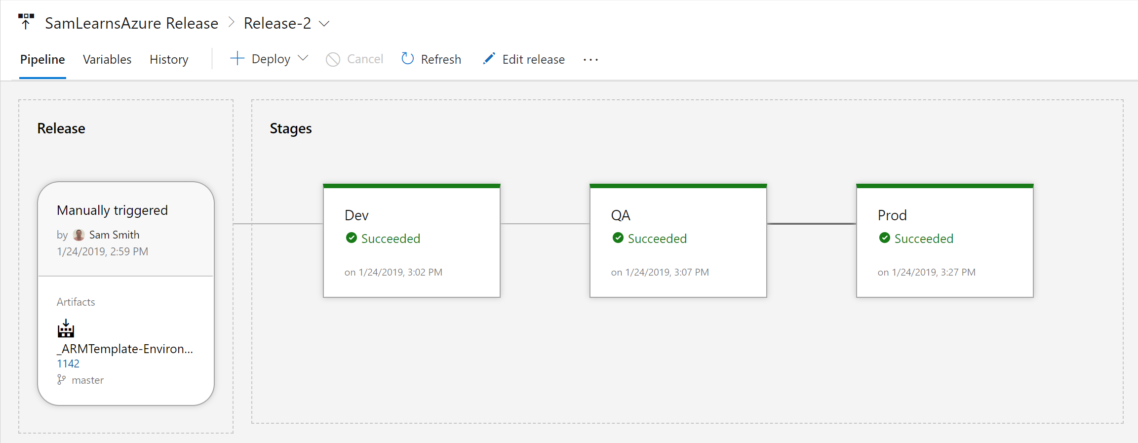 We are ready to queue our second release. We queue it up, and watch it release to Dev (again), then QA, and finally Prod. We are successfully deploying our infrastructure as code!