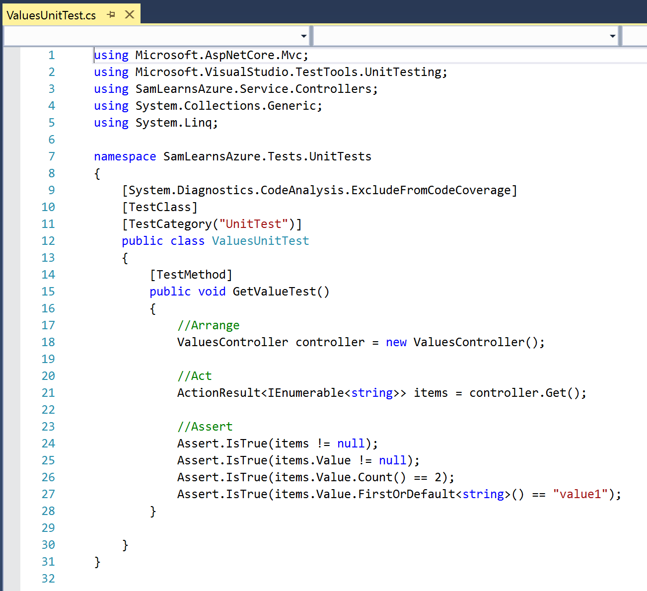 In our Values test , we initialize the “ValuesController”, call the Get function to return values, and finally confirm that we received the results we expected.