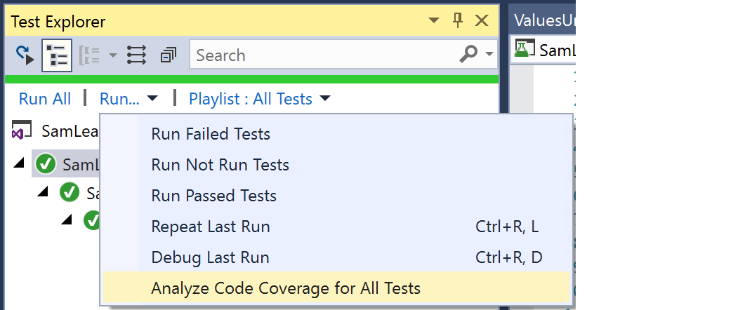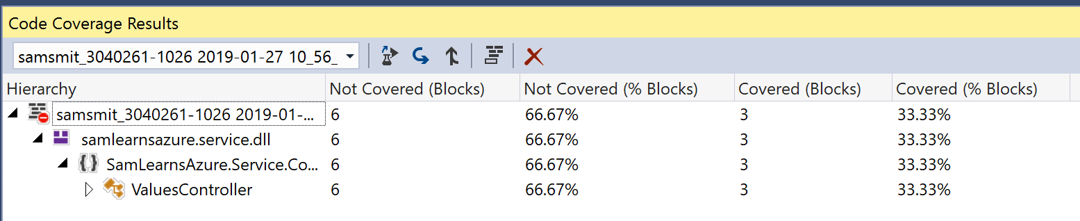 Running the code coverage analysis again with only our custom code, shows 33% code coverage. This is a better indicator of what we need to write tests for – those 6 blocks in the ValuesController.