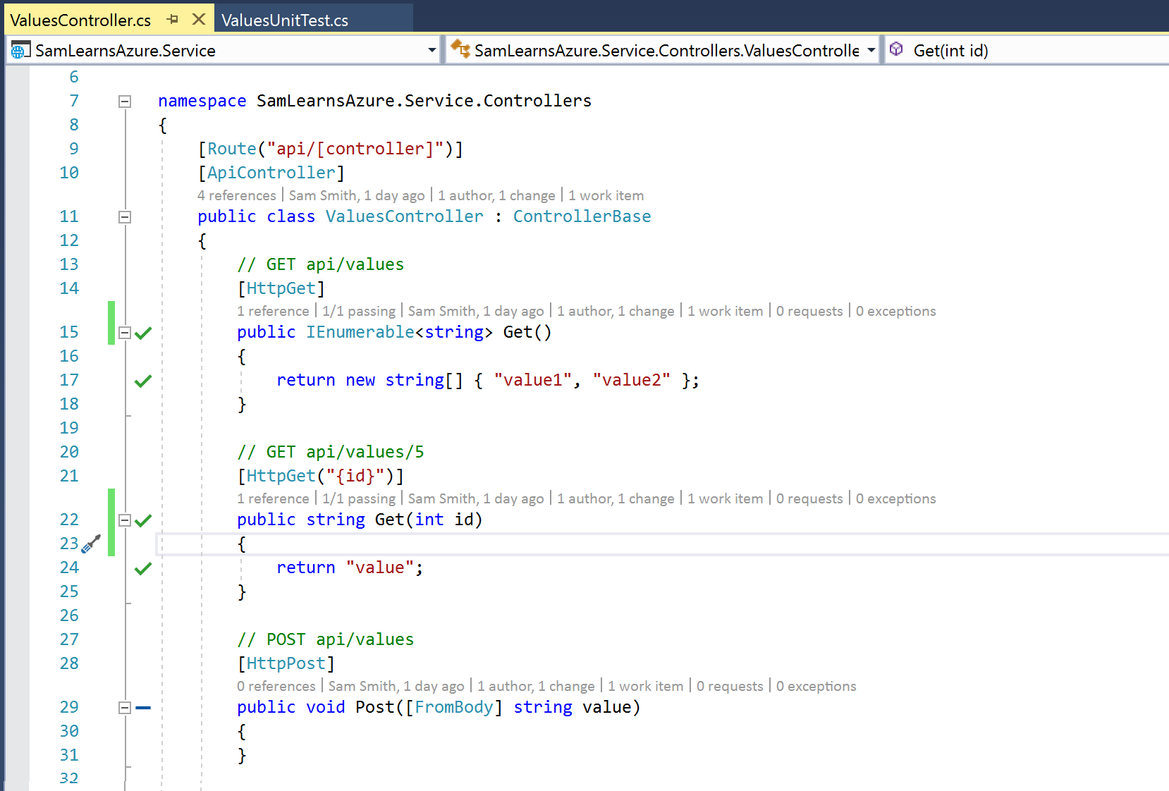 Live unit testing is shown visually in the left column of our code in Visual Studio editor with the green checkmarks (test running successfully), red crosses (test failing), and blue dashes (no test covering this code). We write a quick (purposely failing) test to verify the Get(id) function, to help demonstrate this in the ValuesController.