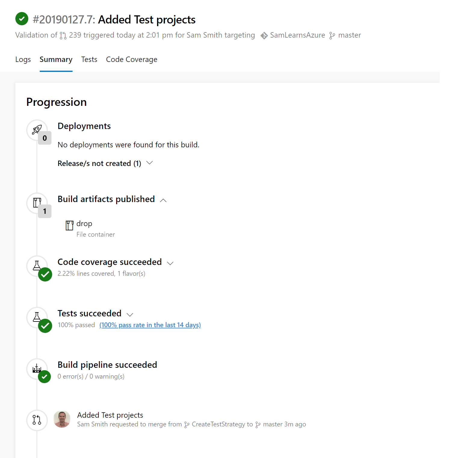Pushing those changes and examining the build summary, we are seeing a lot of detail now. This is a pull request build, so no deployment is created. The build artifacts contain the web service zip and the functional test files. All of the tests passed – but what happened to the code coverage? Even though we reached 100% in Visual Studio, this is showing the code coverage as only 2.22%!?!