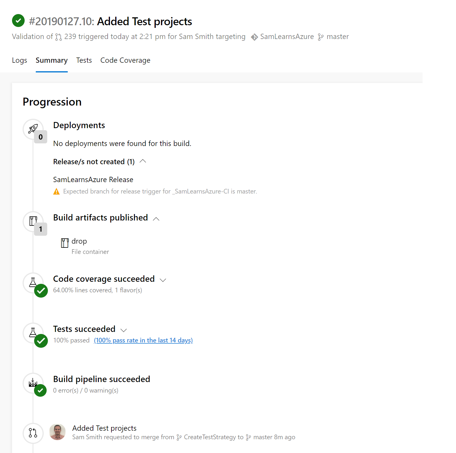 With this in place, we push our code and check the Pull Request build again, where we see the code coverage calculations are now working much better, and not including Moq.dll. Unfortunately, while Visual Studio Test Explorer uses “Blocks” to measure code coverage, Azure DevOps uses “Lines”, and this creates a disconnect. Still 64% is a lot better than 2.22%, so we will take this for now, until .Net Core is updated to fully support these scenarios. At the end of the day, the actual code coverage isn’t important, it’s more an indicator that we aren’t adding code without tests. For example, if we add a feature and note that the code coverage has a significant drop, we can conclude that the testing for this feature needs further investment.