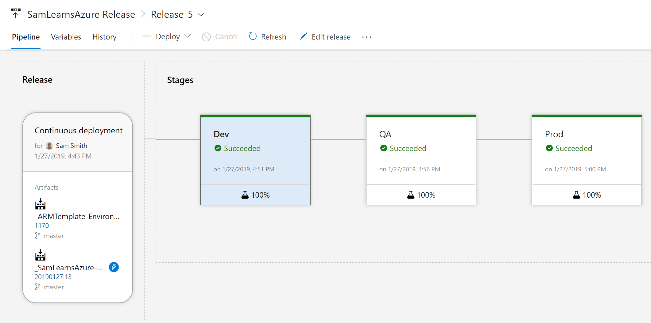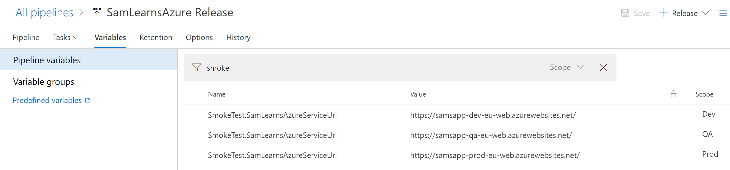 The first step is to add new variables for each environment, naming the variable “SmokeTest.SamLearnsAzureServiceUrl”.