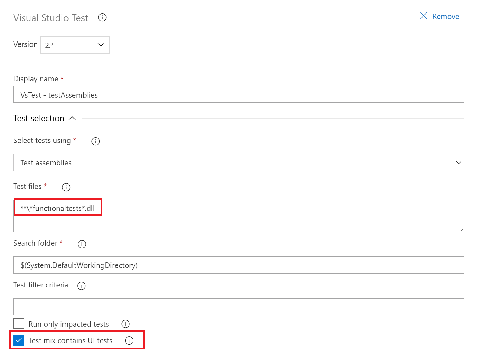 In the “Visual Studio Test” Task, we update the “Test files” property to only match our functional tests (we don’t want this to run any unit or integration tests), and check the box to indicate that the “Test mix contains UI tests”.