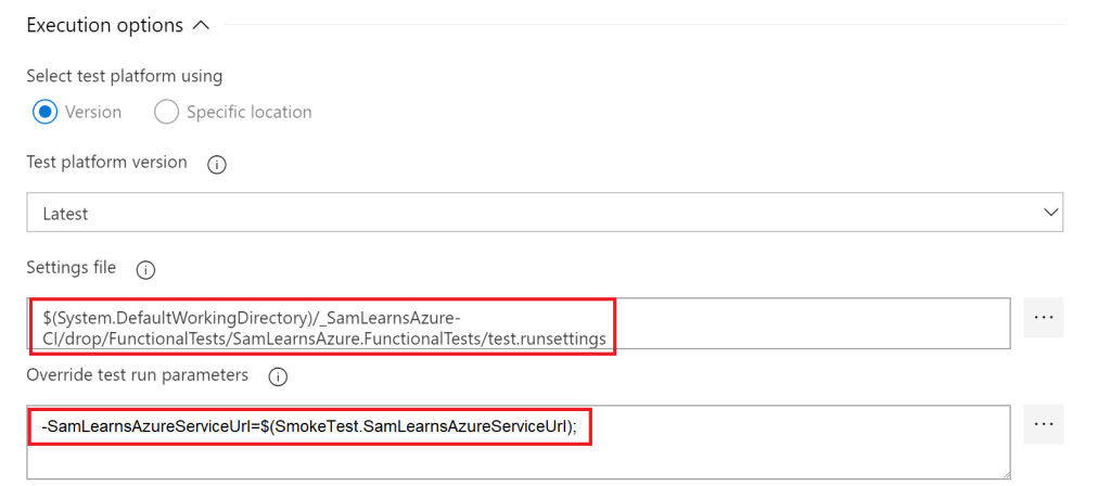 In the “execution options” of the “Visual Studio Test” task, add the settings file from the build, and use the variables we just created to pass in the path to the web service we are going to run the tests against.