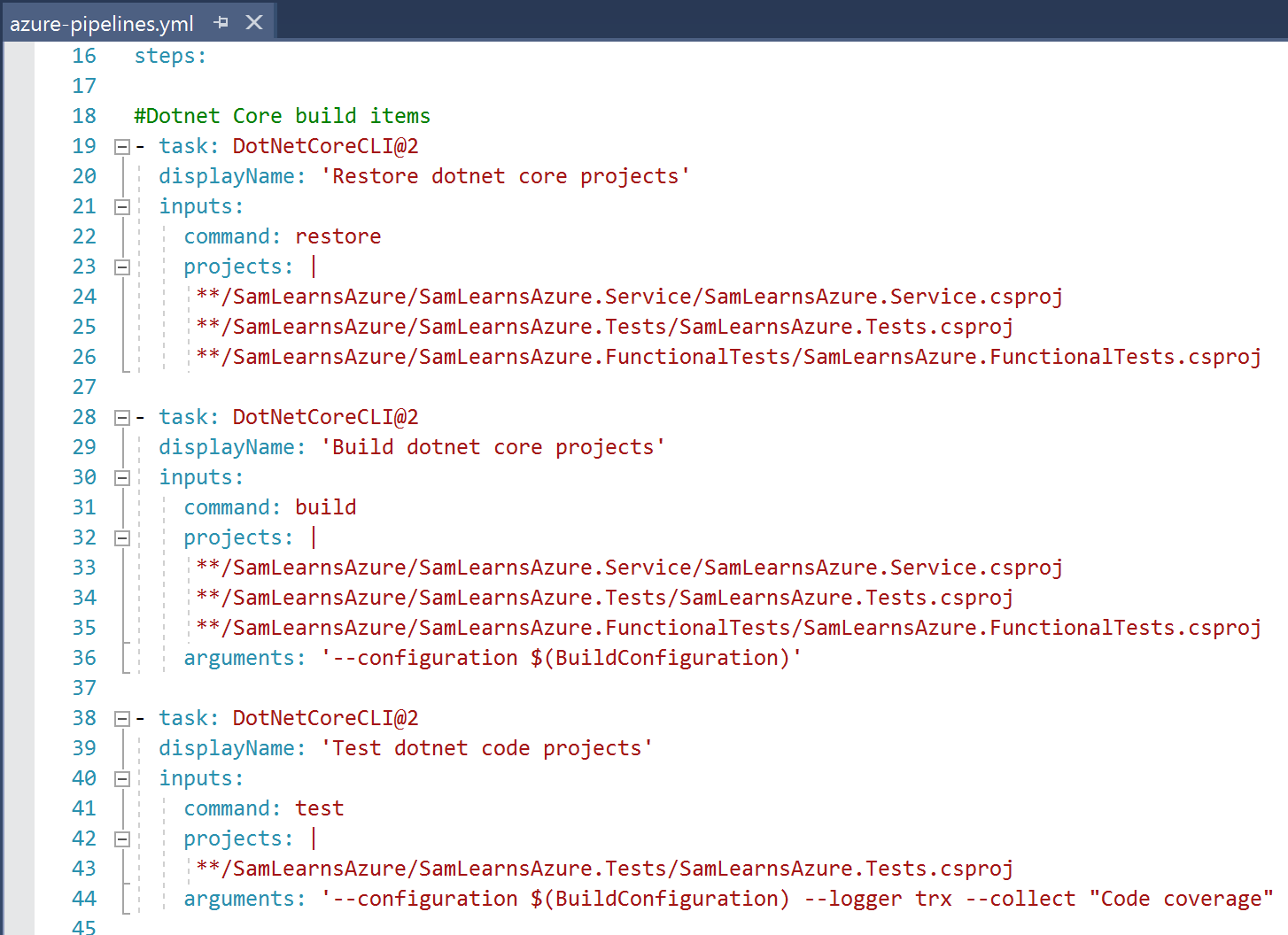 Now it’s time to update the build definition so we can build the projects and run the tests. We will need to add the test projects to the “dotnet restore” and “dotnet build” sections, and a new section for “dotnet test”.