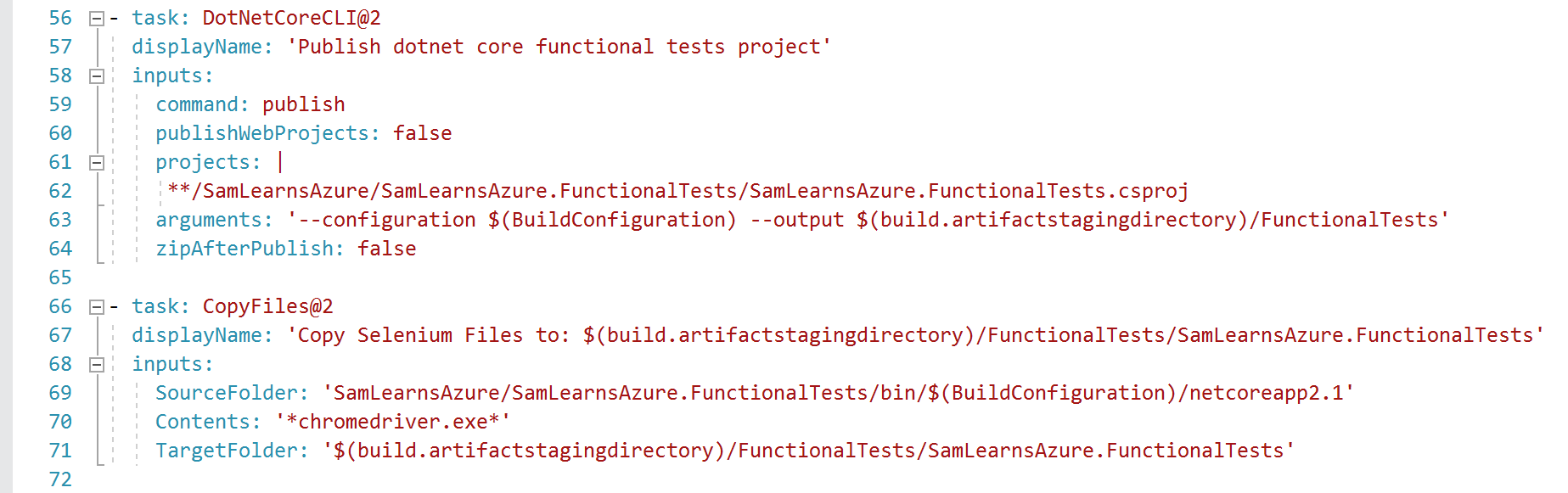For the Selenium functional tests project we need some extra YAML to publish the project without zipping it, and to copy the chromedrive.exe file – which is not otherwise copied. This allows us to reconfigure the project configuration and run it on each environment easily.