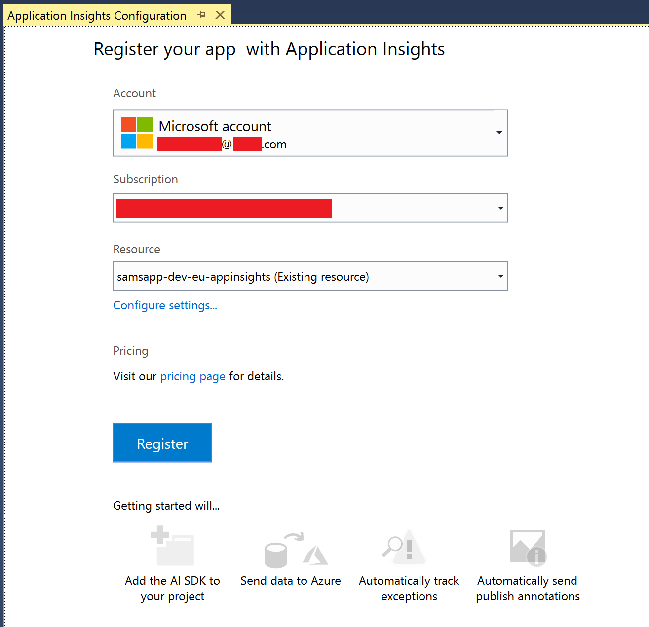 We then register the application with our account, subscription, and target our dev instance of application insights that we created with our ARM Templates. As we move through this process, we will later target each environment in Azure Pipelines to configure Application Insights for each release.
