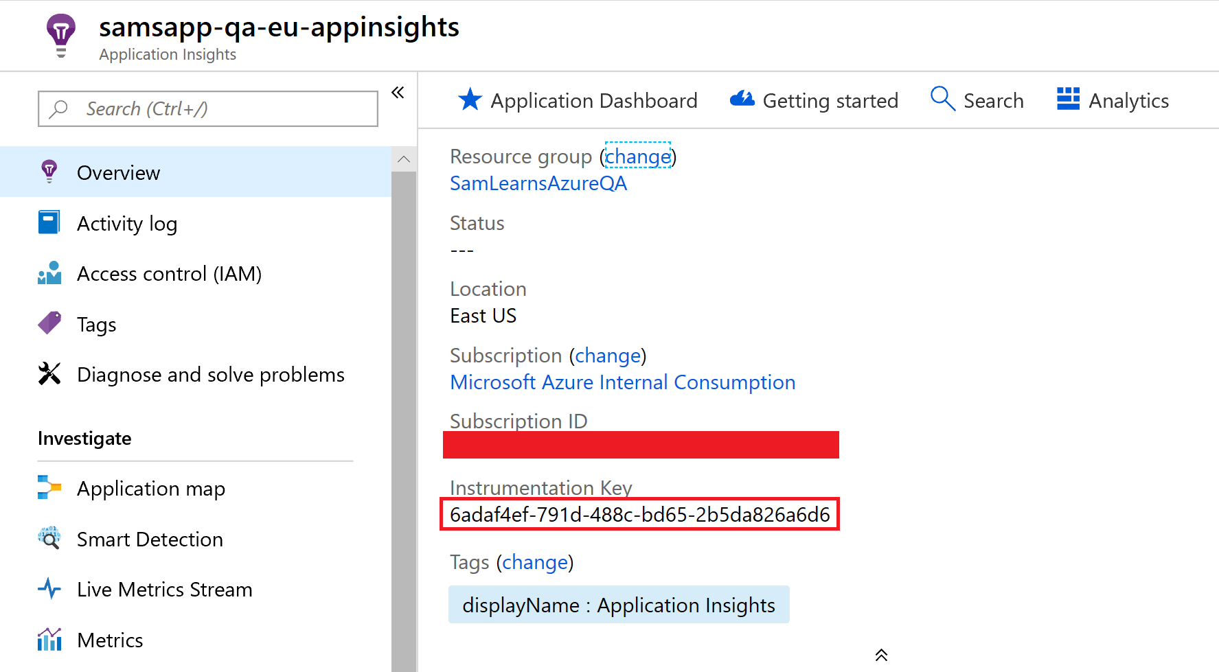 In our Azure portal, we browse to each Application Insights instance and make a note of each instrumentation key.