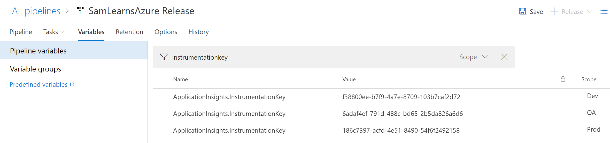 In the Release pipeline variables, we add a new variable for each environment, configuring the scope for each environment (so the Dev scope deploys that variable to the Dev environment), and then use the “.” to separate parent and children relationships in the appsettings.json document. For example, as InstrumentationKey is a child of ApplicationInsights, we use the format “ApplicationInsights.InstrumentationKey” – this will find the “ApplicationInsights” parent, then child “InstrumentationKey” and assign the value to it.