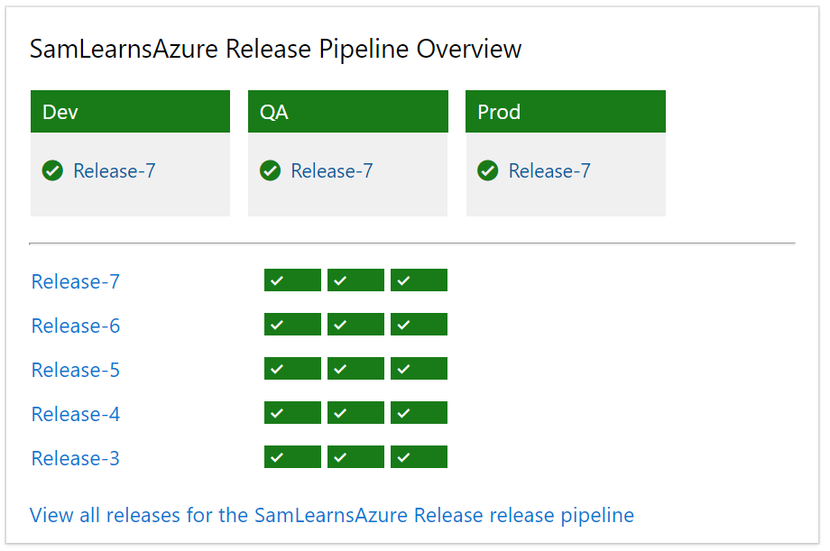 In the widget we can see which release has been deployed to each environment, and a history of the last 5 releases. Similar to the build history widget, the result, indicated by color: green is successful, yellow is partially successful, red is a failure.
