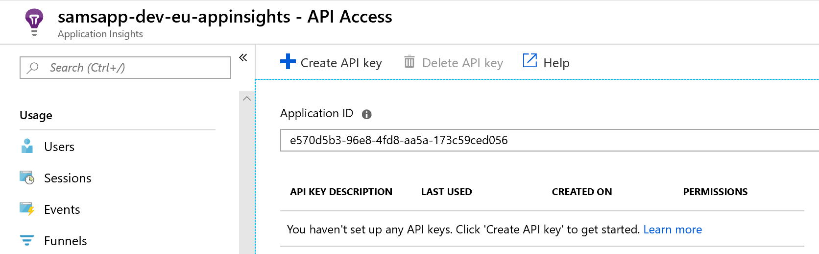 To use this widget, we need to open each of the Application Insights instances, and in the configure section, find the “API Access” menu item. Make note of the Application ID on this page for later and then click the “Create API Key” button.