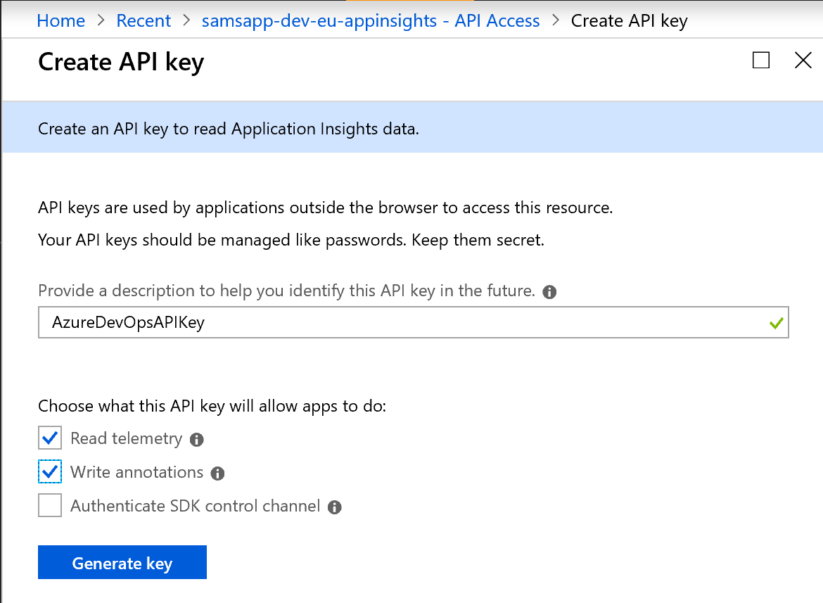 Add a name of the API Key, checking the “Read telemetry” and “Write annotations” check boxes and then click “Generate Key”. These features allow the API key access to read and write Application Insights to/from Azure DevOps.