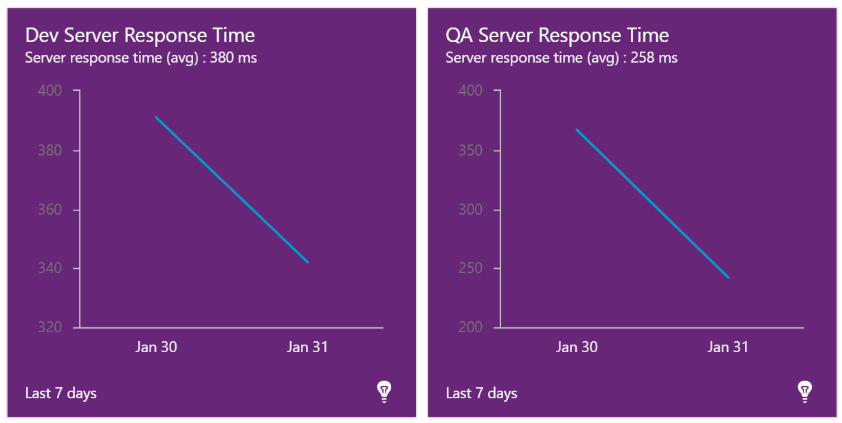 Next, back in the Azure Devops dashboard, we add a “Azure Application Insights Chart Widget” for each environment. This is where we need to paste in the “Application Id” and “API Key” we extracted from our Application Insights instances. We are going to use the “Server response time” metric, and the “Time range” of 7 days. This will give us a good overview of our application performance.