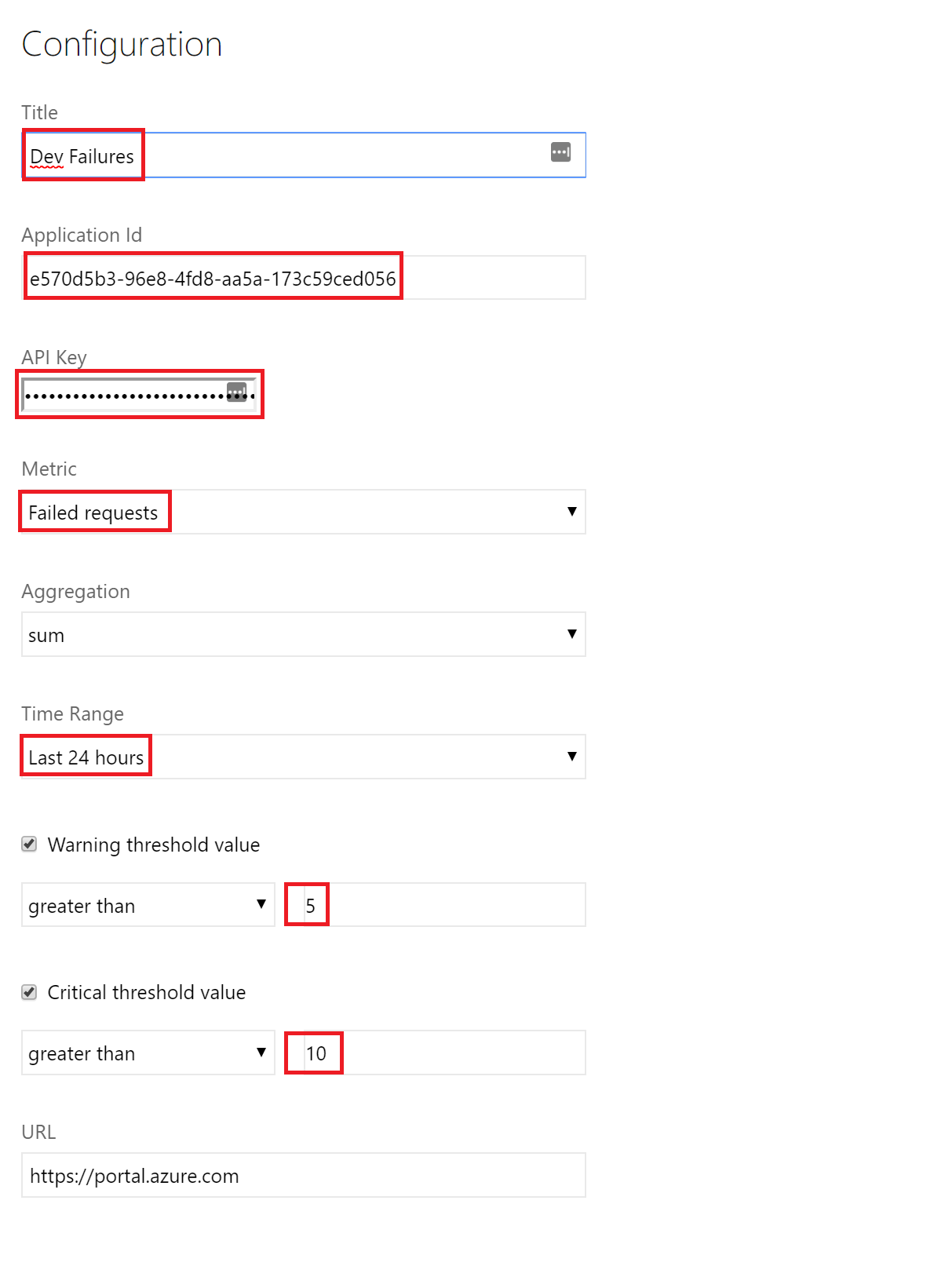 We are going to add two more “Azure Application Insights Metric Widgets” for each environment (for a total of six). We are going to use the metric of “Failed Requests” and “Dependency Failures”. For this metric, we are just going to look at the last 24 hours, and use the warning and critical thresholds. These are neat, if it’s over the warning threshold, the widget changes to an orange color, if it’s over the critical threshold, it changes to red. We set these slightly different for each environment – for Dev we are more forgiving using a warning value of 5 and a critical value of 10, but for production we are more strict, using a warning value of 0 and a critical value of 5.