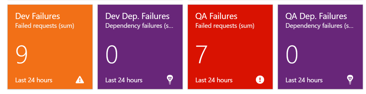The resultant metrics shows our dev and QA metrics, with the failure count triggering the warning color in dev and and error color in production.