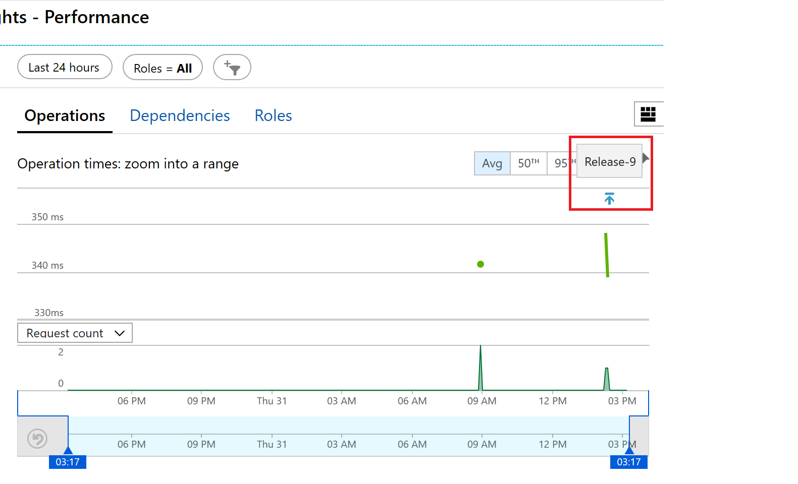 With the new task added and configured, we queue a new release. Once the release is complete, we can see the result in Application Insights, and can now have more information to troubleshoot performance changes. In our screenshot below we can see the annotation indicating we just released “Release 9”.
