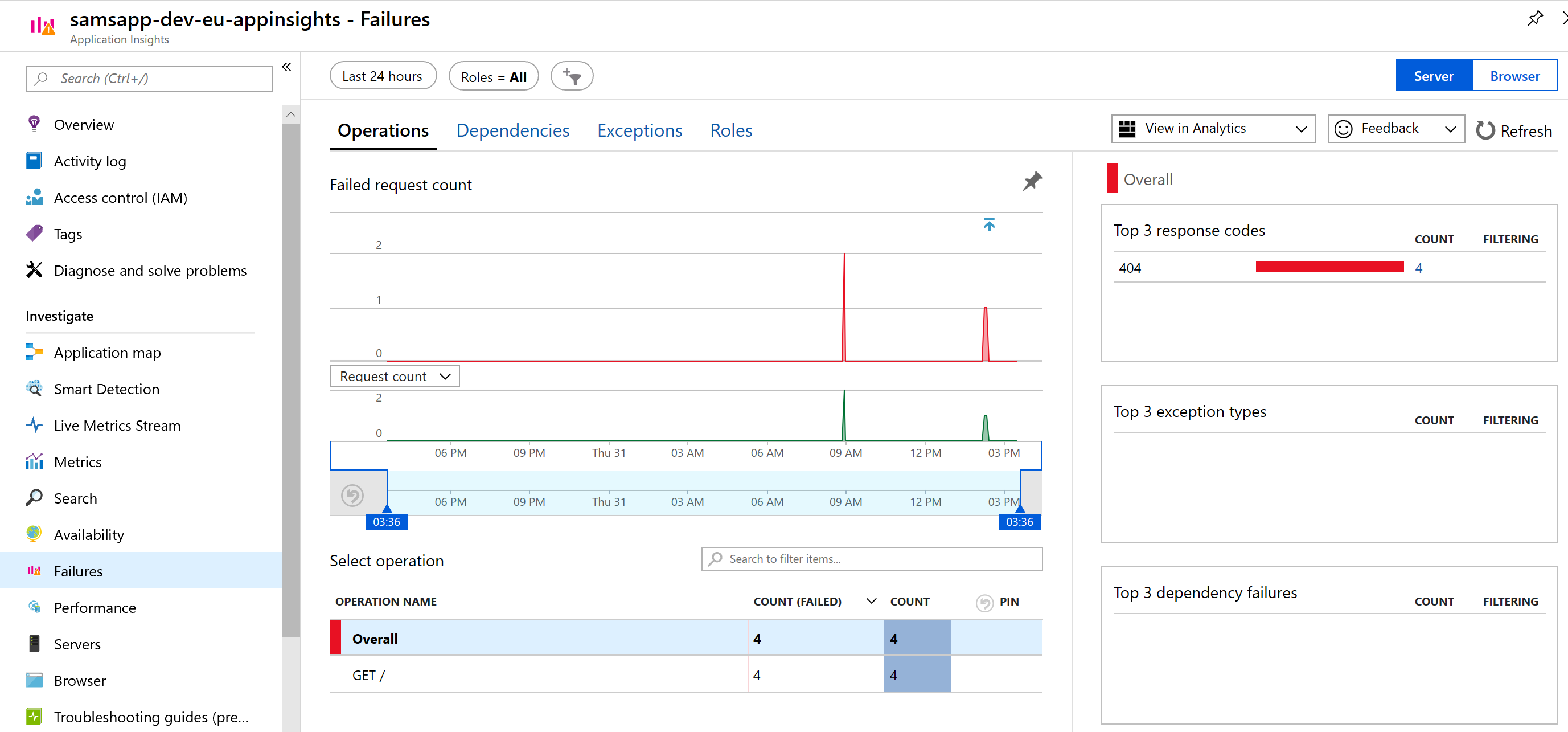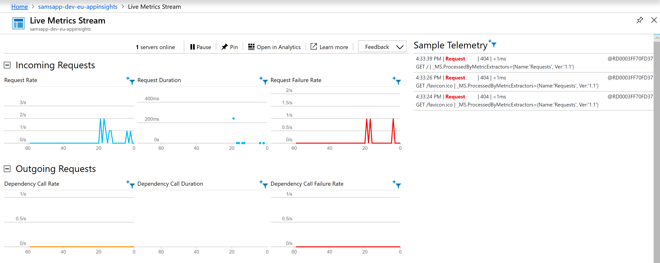 Live Metrics: observe the current state of the application – very useful after a release to ensure that pieces are working how we expect them to work. In this case we browsed to our web service 5 times, with an error in the middle. What is interesting is that we actually have 3 errors here – when we were only expecting one. The two extra errors are how we discovered the missing favicon.ico file we mentioned earlier.