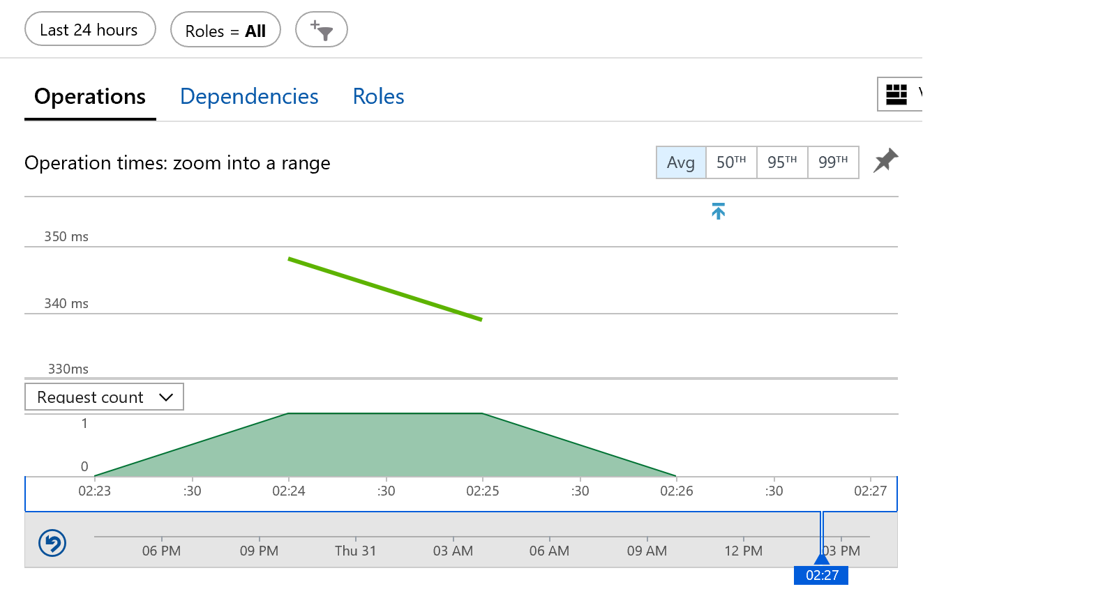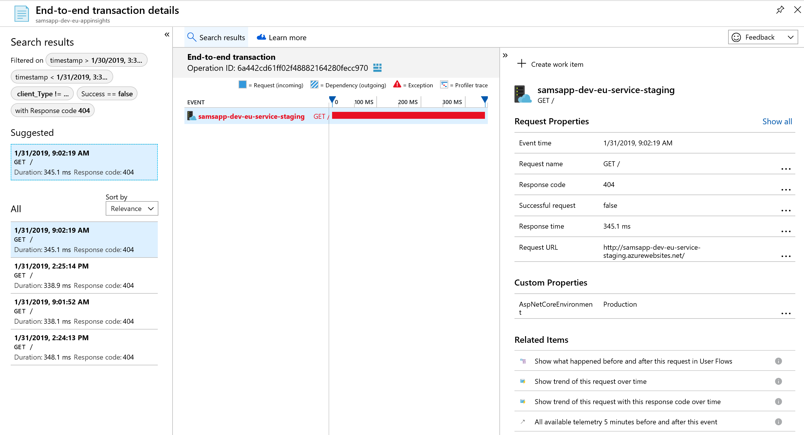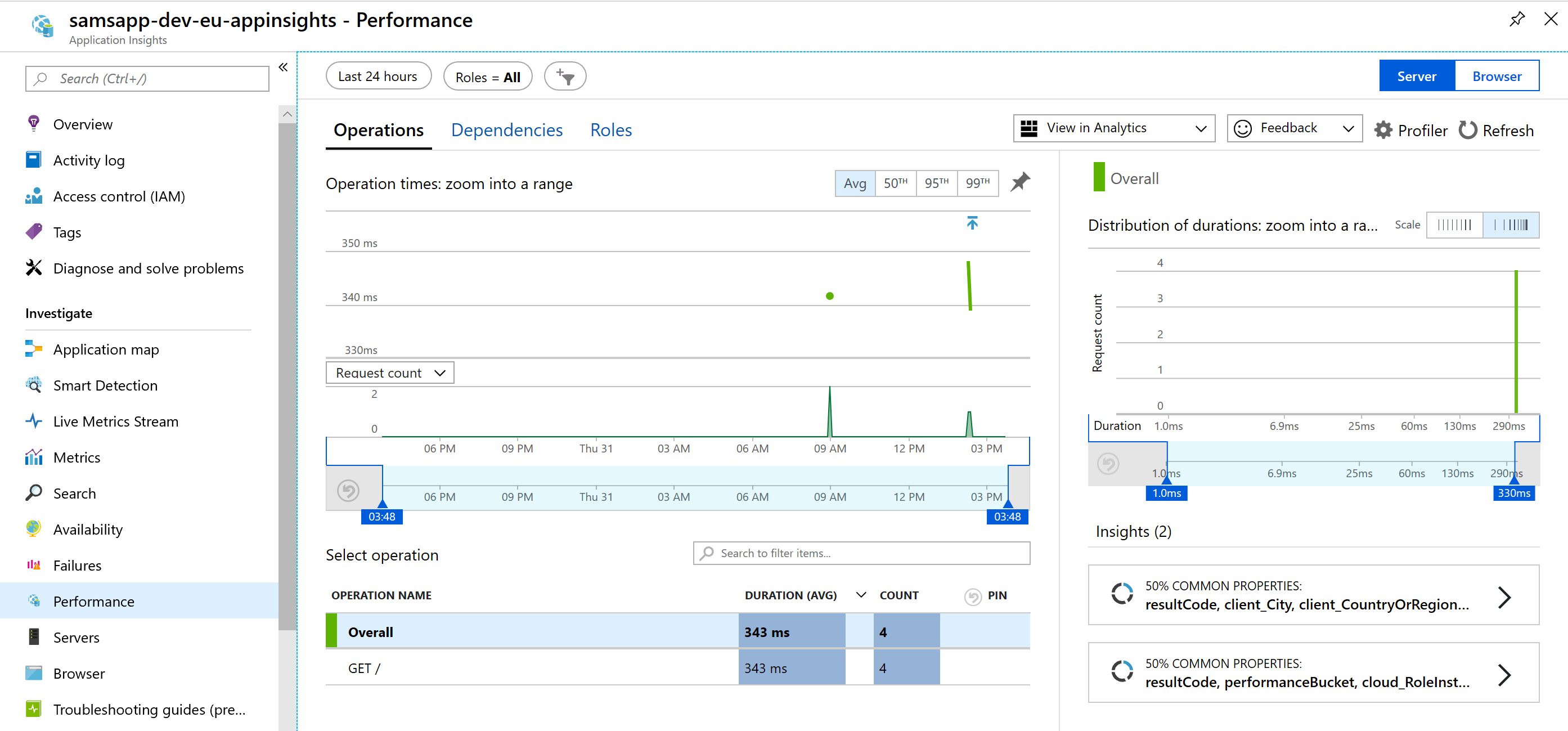 Application Map: observe a visual map of how the pieces are connected together and any potential issues. In the past, we have found this useful to confirm that the items we are expecting to be part of this environment are present – for example, that the dev service is using the dev database. In previous projects we’ve come across situations where the prod service was accidentally using a qa database – not a good situation. This Application map is from the documentation, and demonstrates some of the features that are available , including average time to run the dependency, number of calls, and percentage of success – as our application map is boring at this stage (we just have a service that isn’t using any dependencies except Application Insights).