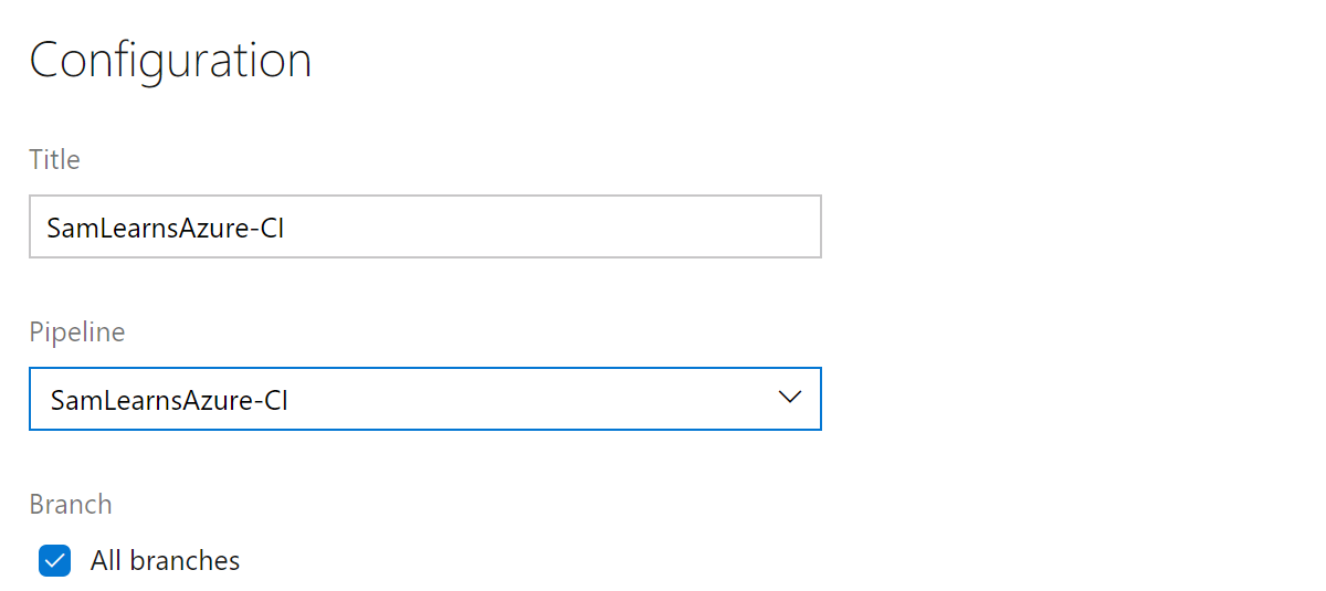 The “build history” widget is relatively simple to setup. We just need to select the build “Pipeline” and select all branches – as we want to see all build issues in all branches.