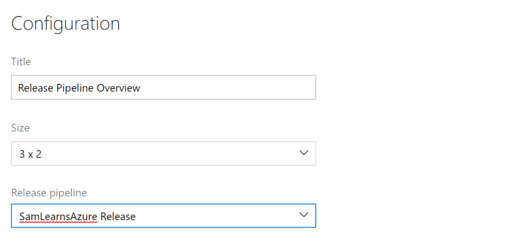The “release pipeline” widget is also relatively simple to setup. We recommend a “3 x 2” size, unless you have more than 3 environments, in which case it should be made bigger.